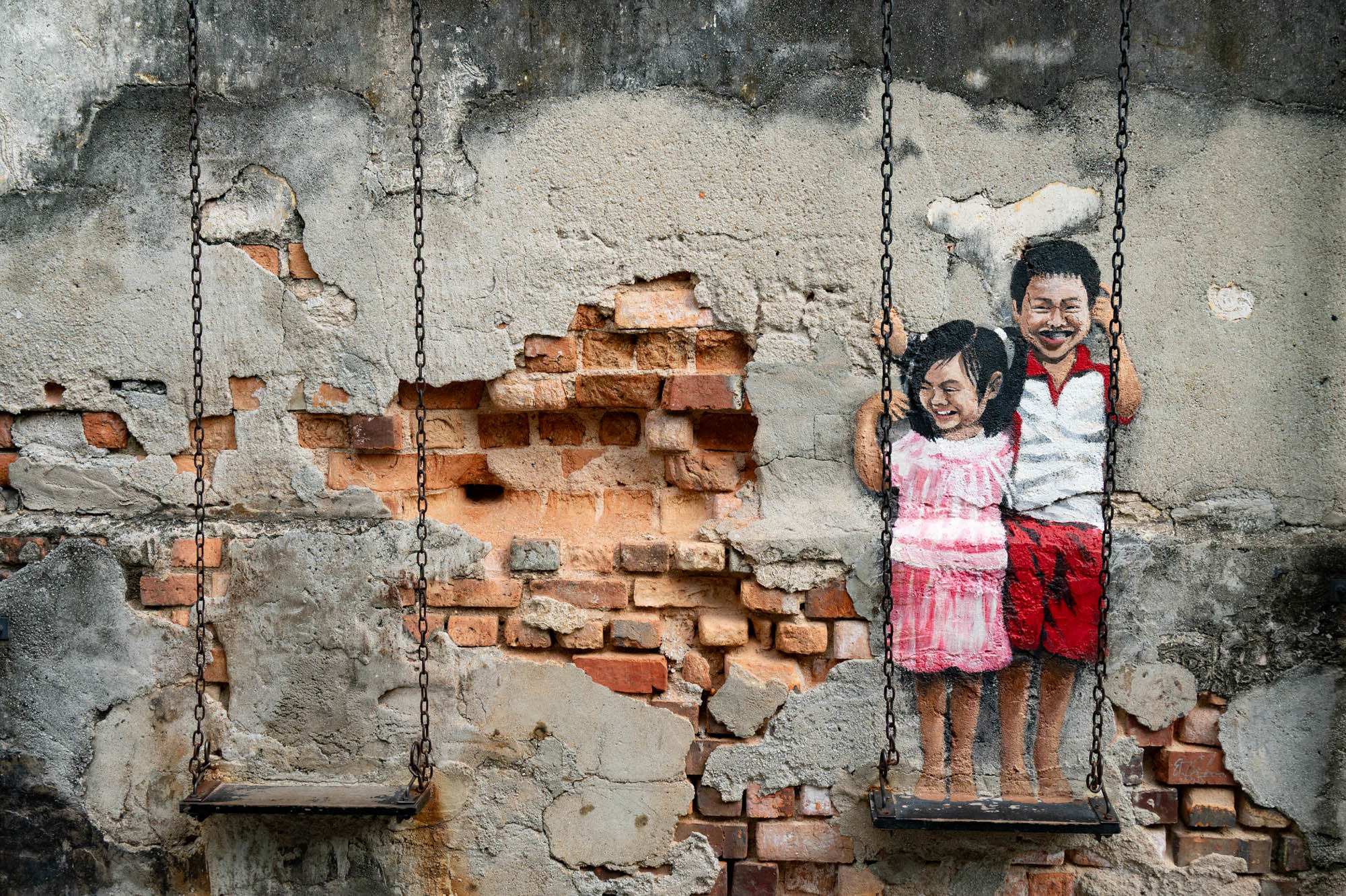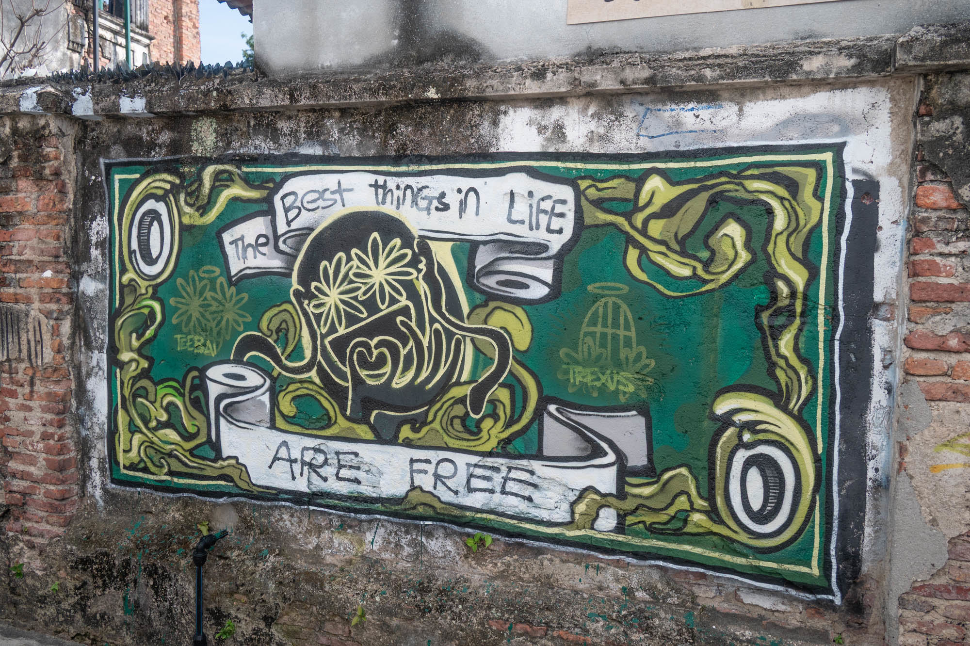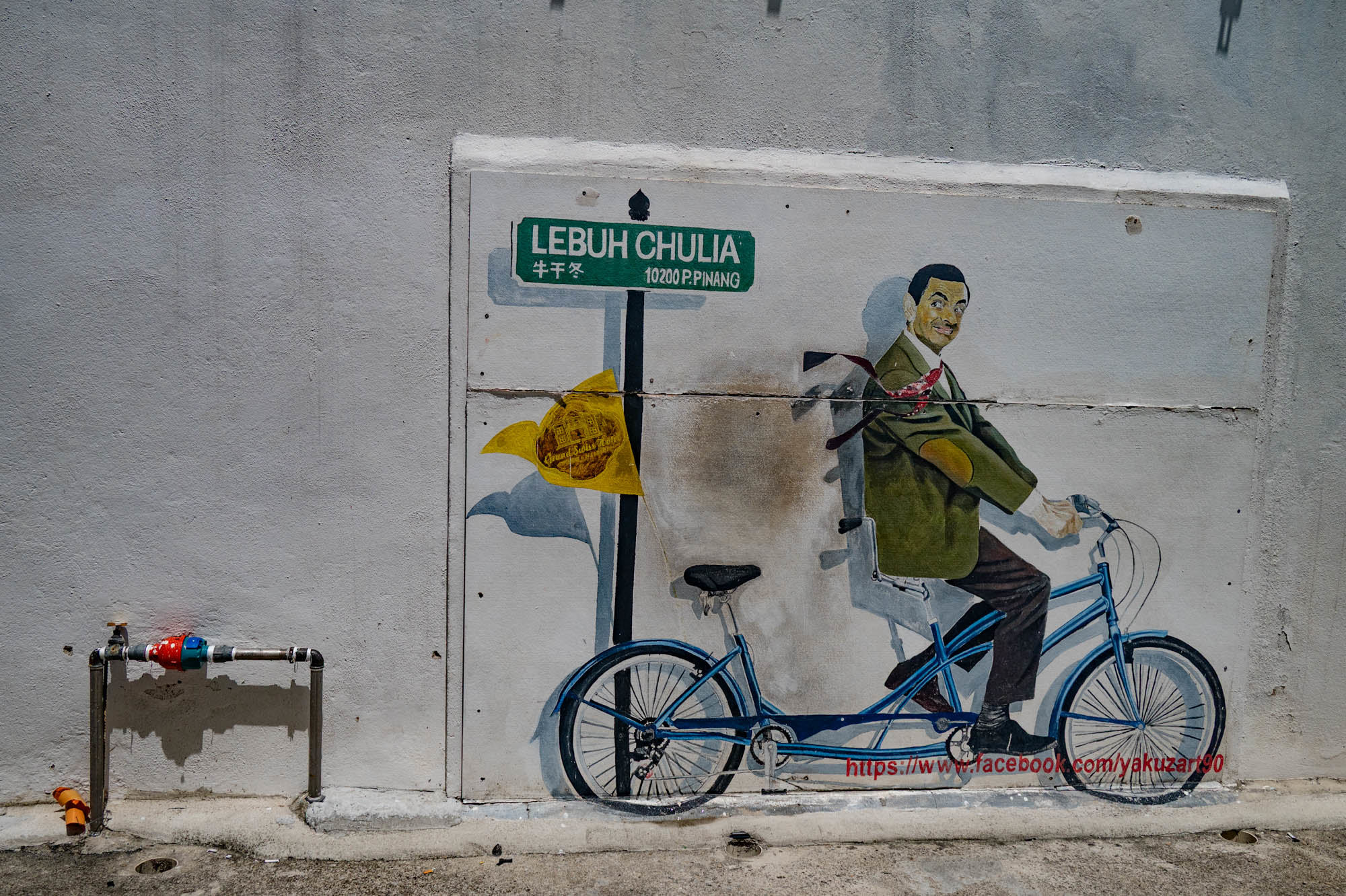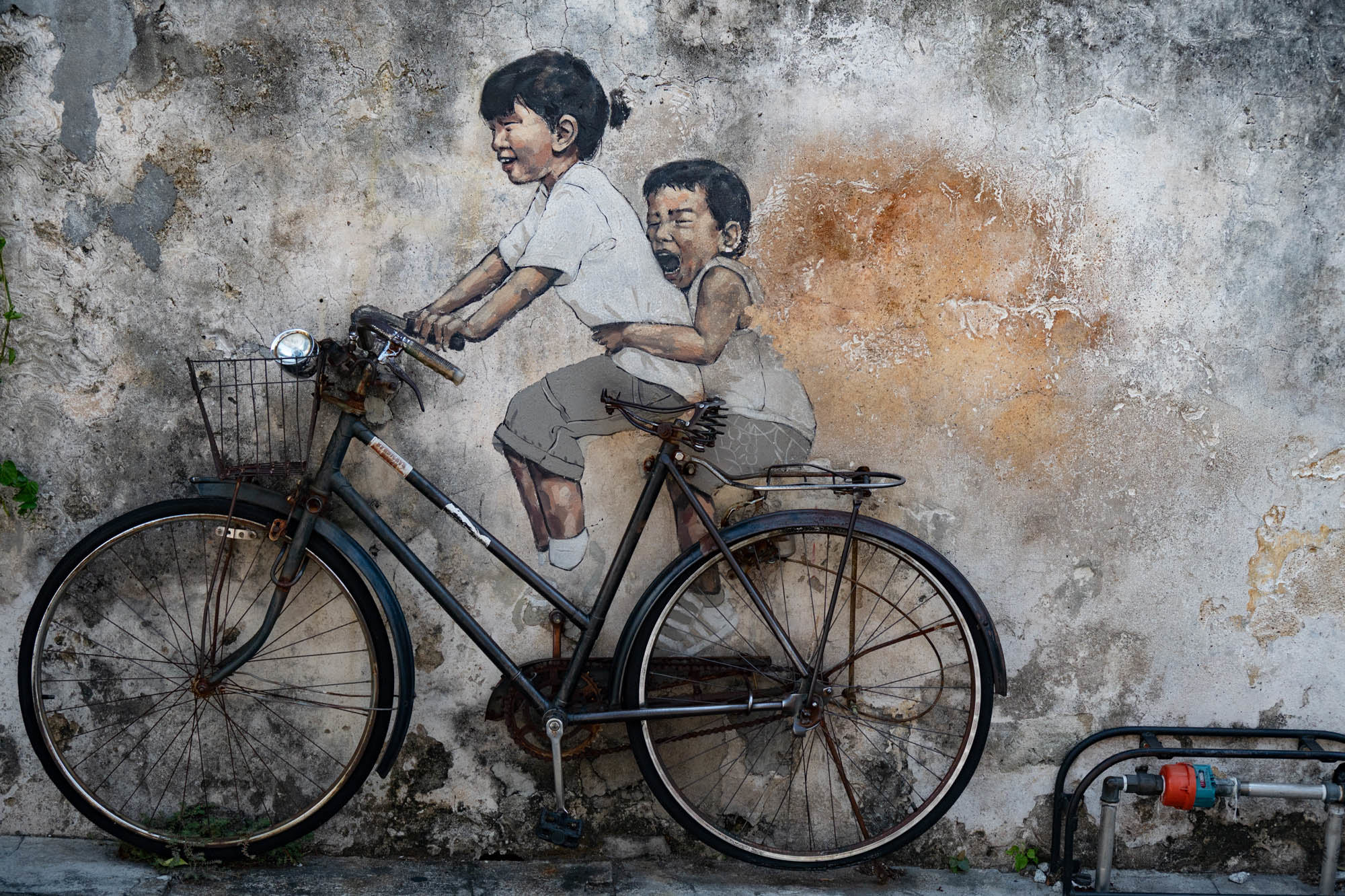 Heb in mijn leven al ontelbare murals, graffiti en streetart gefotografeerd maar nergens was het met zoveel humor en ontroering gemaakt als hier in Penang. Niet alleen hebben de kunstenaars hun ziel en zaligheid in het werk neergelegd maar ook de ziel van de stad naar boven gehaald. Achter elke straathoek wacht een kunstwerk, je moet er enorm veel voor lopen maar dan verzamel je een prachtig album van kunst. De rijke mix van Maleise, Chinese, Indiase en Europese invloeden die deze stad zo geweldig maakt komt terug op de soms vervallen muren. Deze kunst ontstond eind jaren zestig/begin jaren zeventig in New York en Philadelphia waar jongeren uit protest of als handtekening namen en beelden op muren en treinstellen begonnen te spuiten. Dat is toevallig ook de tijd dat ikzelf op de kunstacademie zat waar we toen vooral heel braaf werk maakten. Ja, wat wil je, het werken met stoepkrijt werd voor de jeugd net verboden. Straatkunst mocht nog niet en kon ook in het begin op weinig waardering rekenen. Pas in de jaren tachtig kwamen er de grote murals bij. Hier in Penang gelukkig geen verbod al zullen er hier bij het begin ook wel wat wenkbrauwen gefronst zijn of dat allemaal zomaar moest kunnen. Ze hebben er veel toeristen voor terug gekregen. Ik was bepaald niet de enige die zijn camera vol schoot.