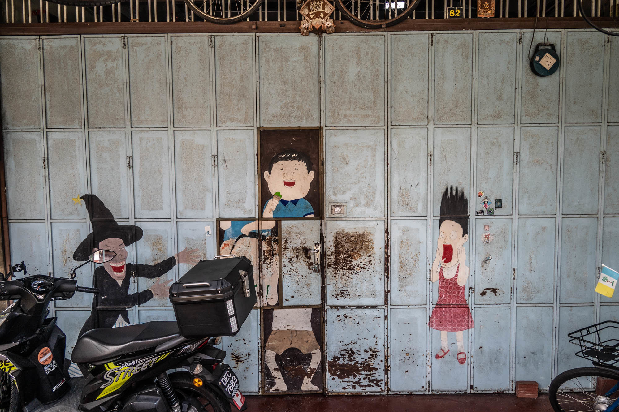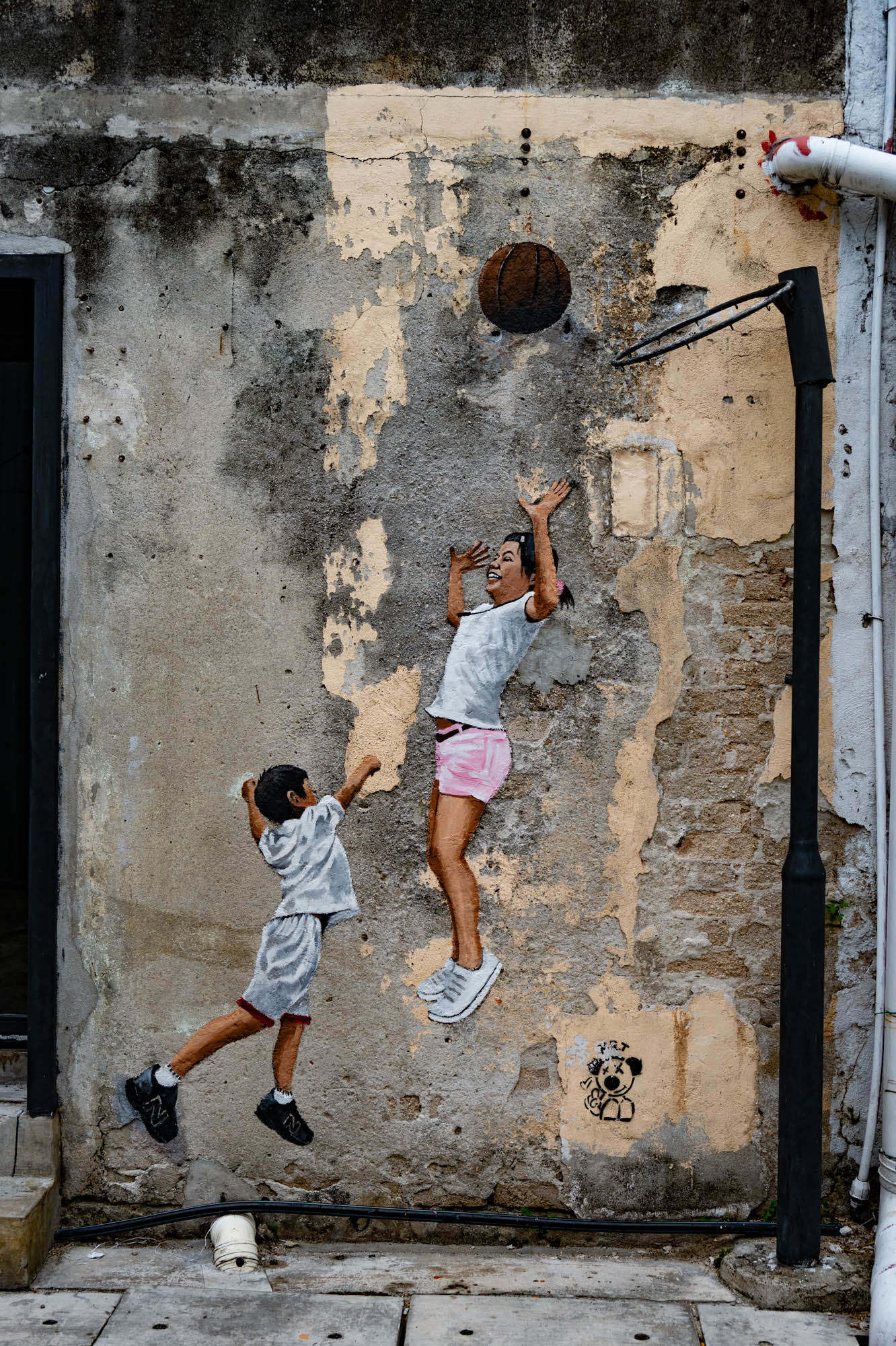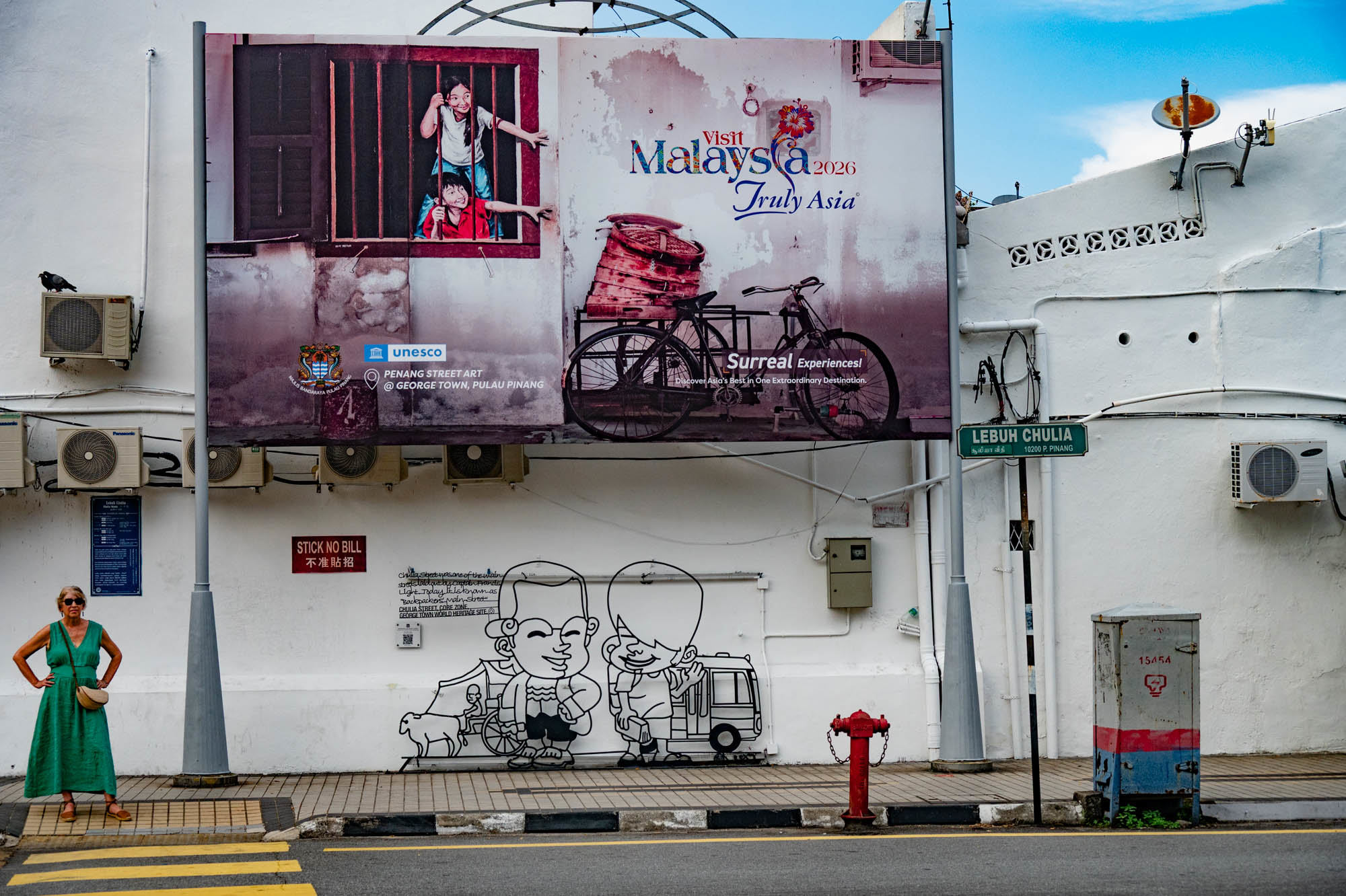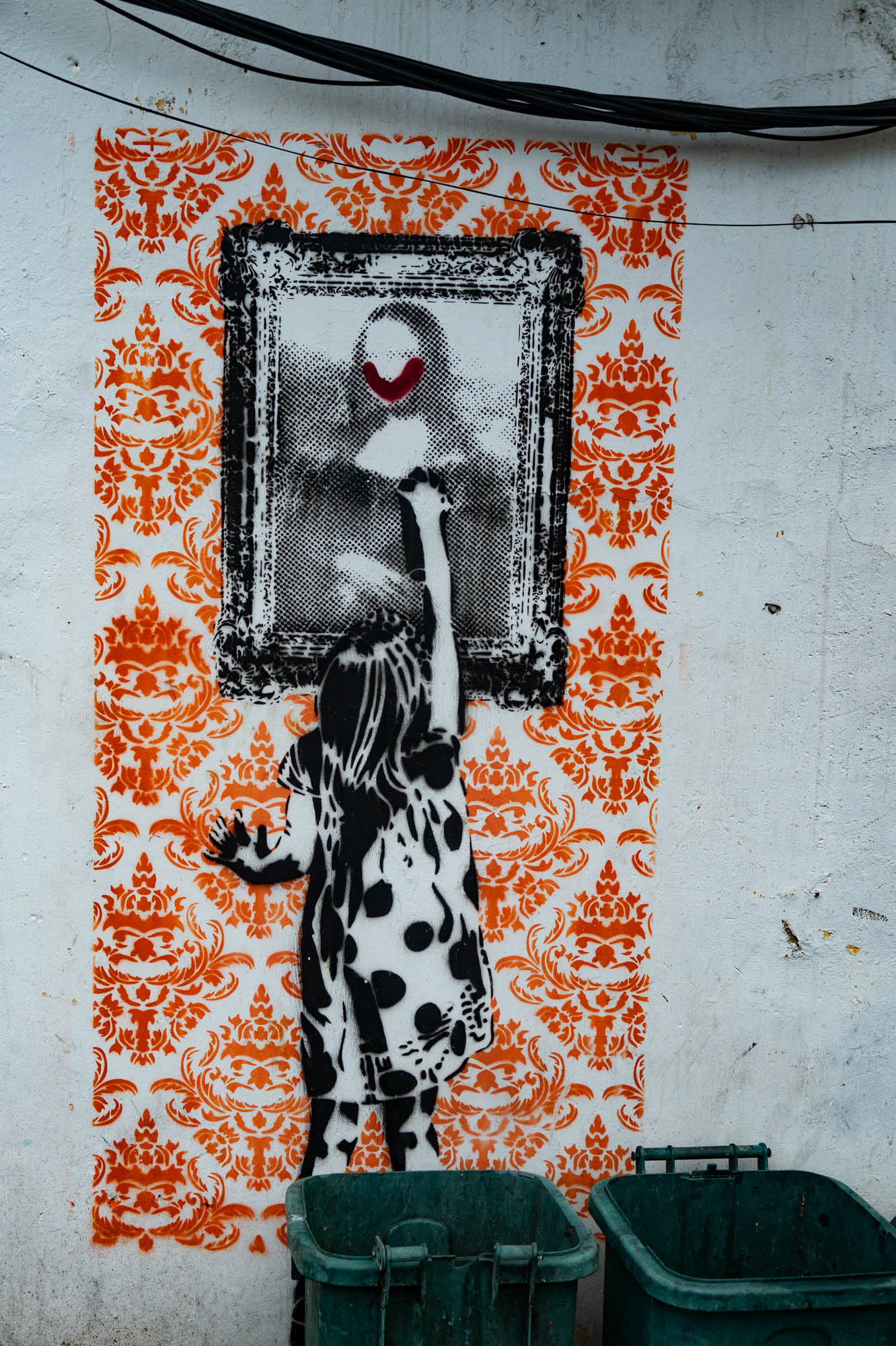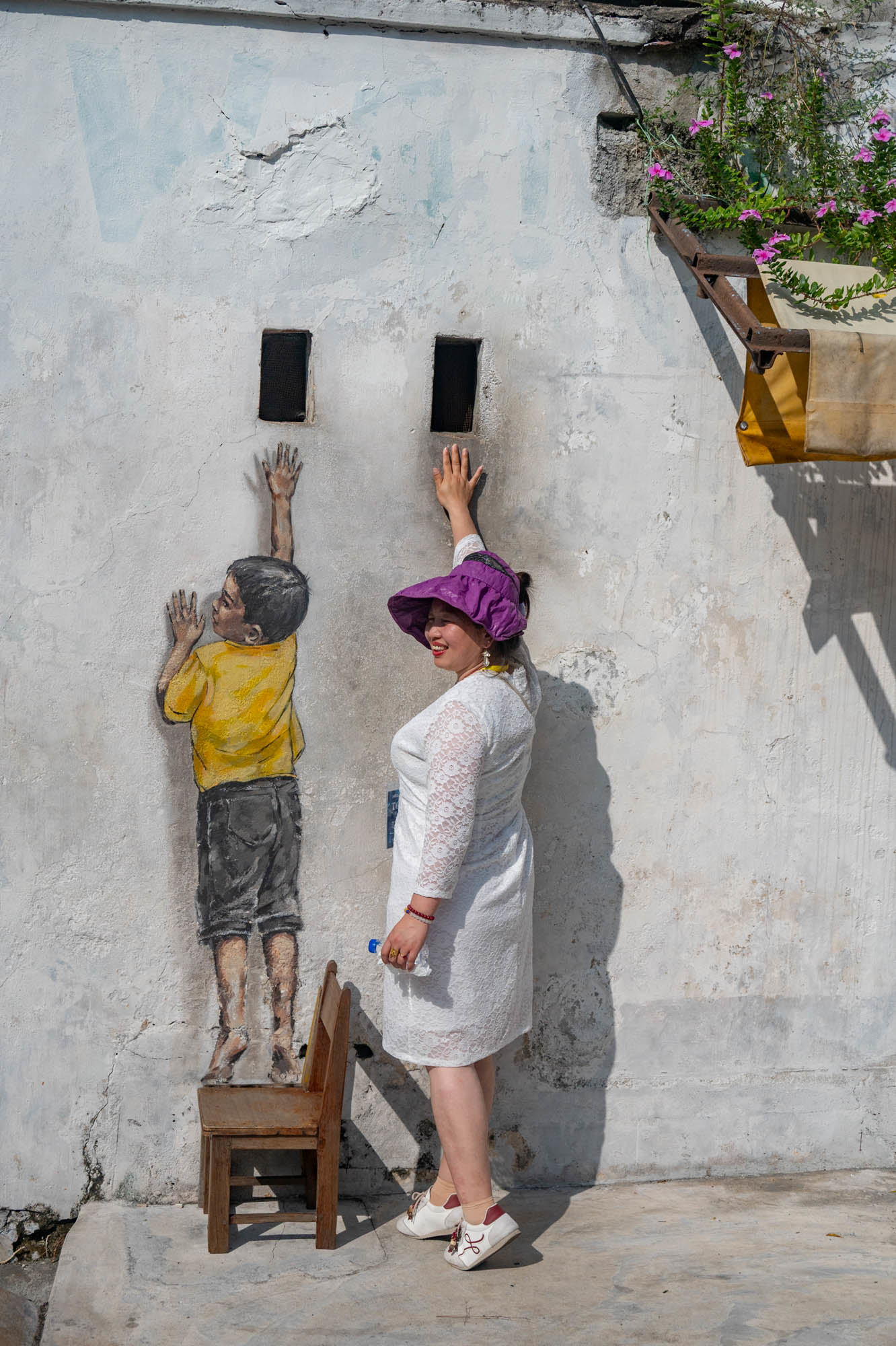 I have photographed countless murals, graffiti, and street art in my life, but nowhere was it created with as much humor and emotion as here in Penang. Not only have the artists poured their heart and soul into their work, but they have also brought out the soul of the city. An artwork awaits around every street corner; you have to walk a tremendous amount to find them, but in return, you collect a beautiful album of art. The rich mix of Malay, Chinese, Indian, and European influences that makes this city so amazing is reflected on the sometimes dilapidated walls. This art originated in the late sixties/early seventies in New York and Philadelphia, where young people began spraying names and images on walls and train cars as a form of protest or as a signature. Coincidentally, that is also the time I was at art school myself, where we mainly produced very tame work back then. Well, what do you expect? Working with sidewalk chalk had just been banned for the youth. Street art was not yet allowed and initially met with little appreciation. It wasn't until the eighties that the large murals appeared. Fortunately, there is no ban here in Penang, although there were probably a few raised eyebrows at the beginning as well, wondering whether all of that should simply be allowed. They have gained many tourists in return. I was certainly not the only one filling up my camera.