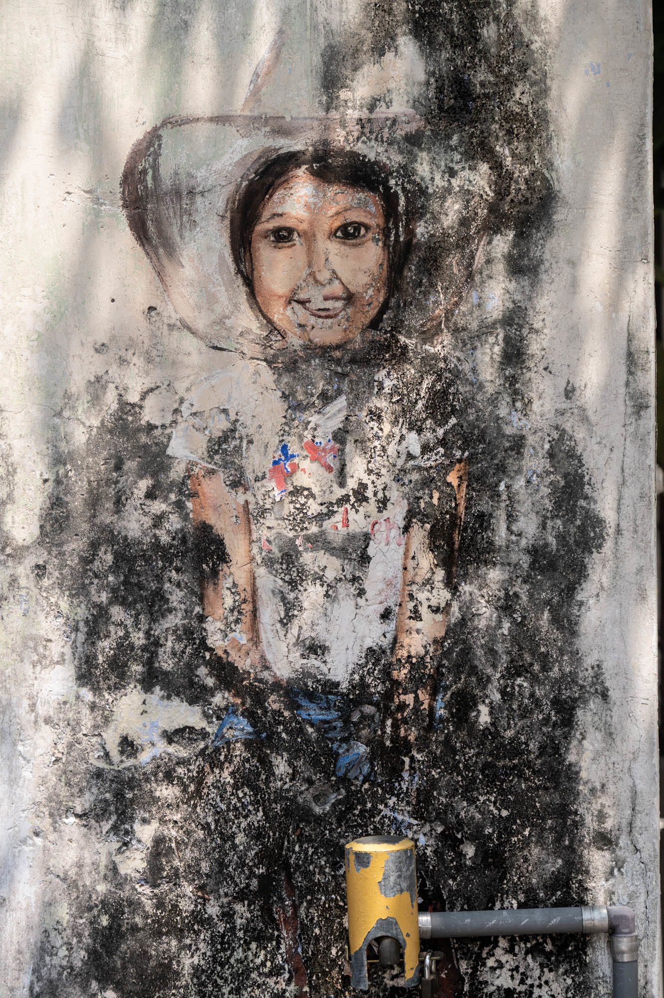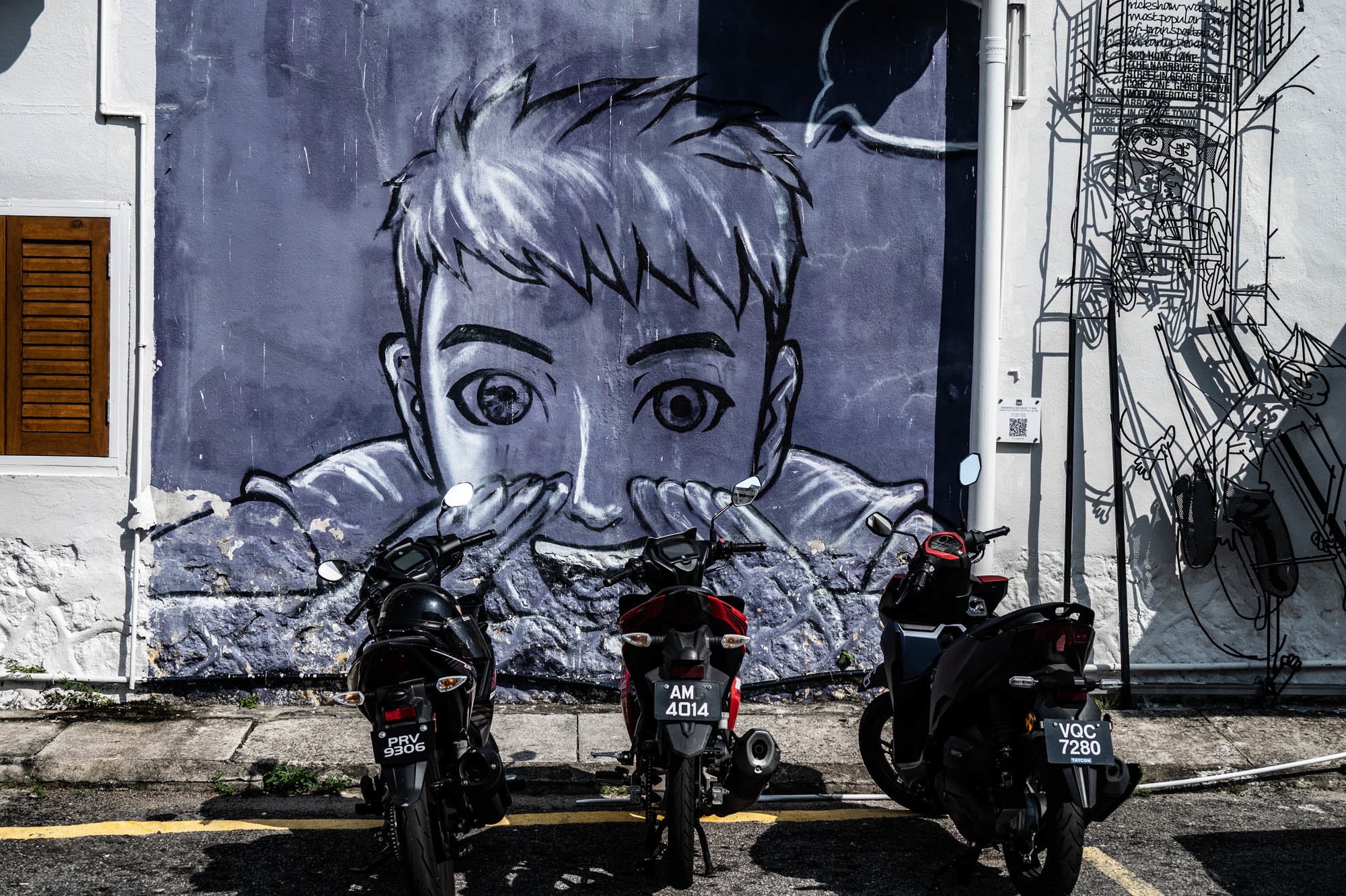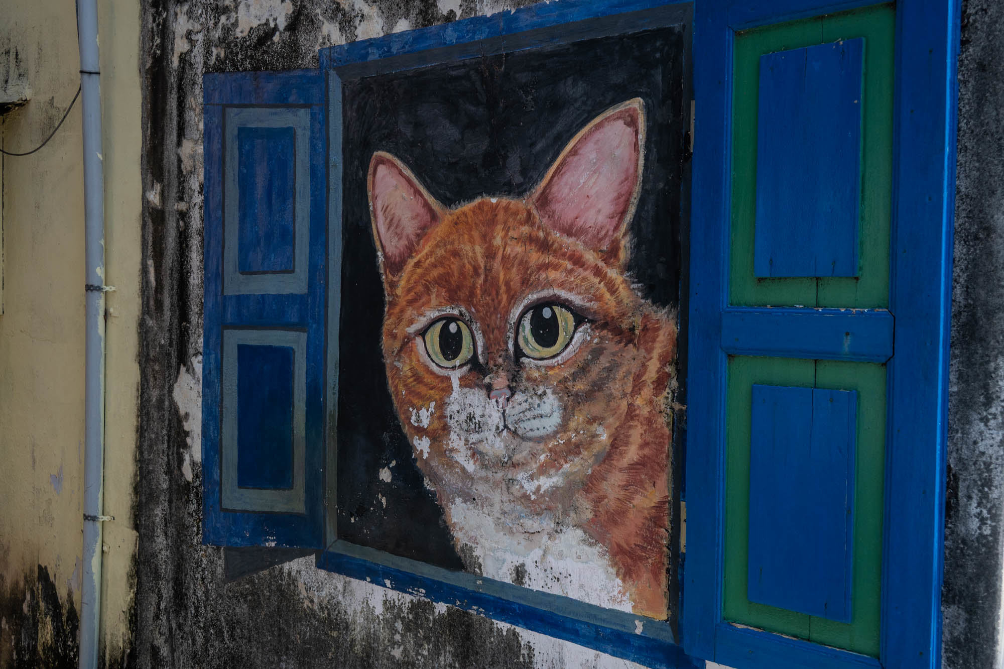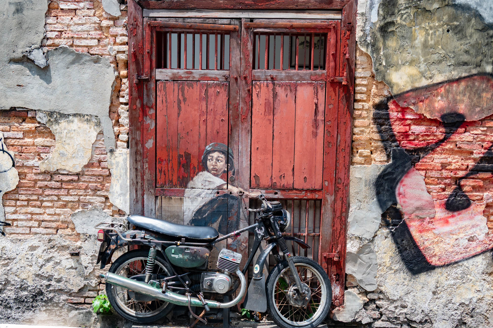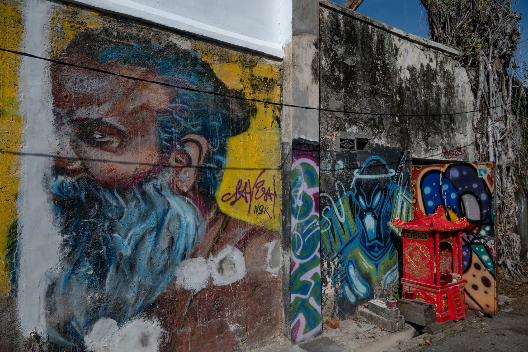 I have photographed countless murals, graffiti, and street art in my life, but nowhere was it created with as much humor and emotion as here in Penang. Not only have the artists poured their heart and soul into their work, but they have also brought out the soul of the city. An artwork awaits around every street corner; you have to walk a tremendous amount to find them, but in return, you collect a beautiful album of art. The rich mix of Malay, Chinese, Indian, and European influences that makes this city so amazing is reflected on the sometimes dilapidated walls. This art originated in the late sixties/early seventies in New York and Philadelphia, where young people began spraying names and images on walls and train cars as a form of protest or as a signature. Coincidentally, that is also the time I was at art school myself, where we mainly produced very tame work back then. Well, what do you expect? Working with sidewalk chalk had just been banned for the youth. Street art was not yet allowed and initially met with little appreciation. It wasn't until the eighties that the large murals appeared. Fortunately, there is no ban here in Penang, although there were probably a few raised eyebrows at the beginning as well, wondering whether all of that should simply be allowed. They have gained many tourists in return. I was certainly not the only one filling up my camera.
