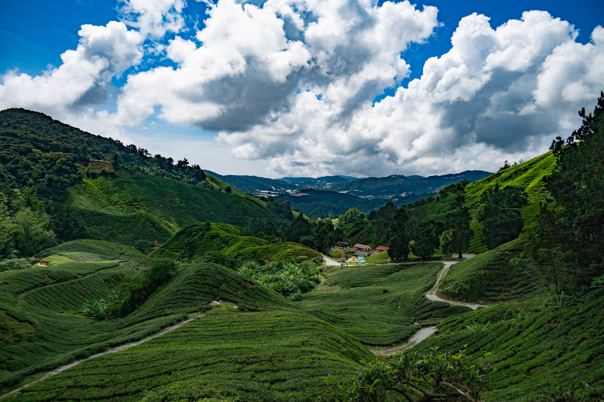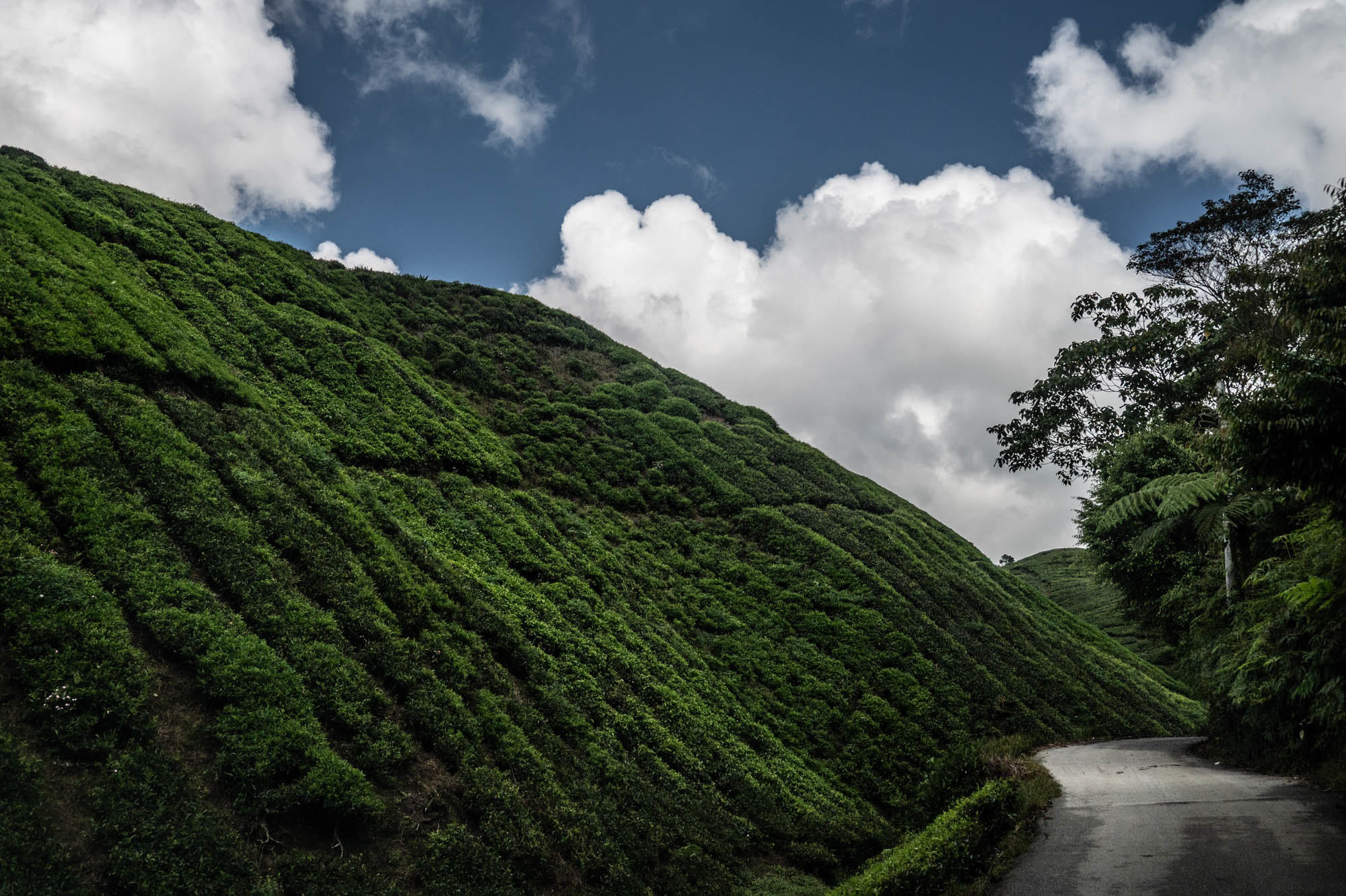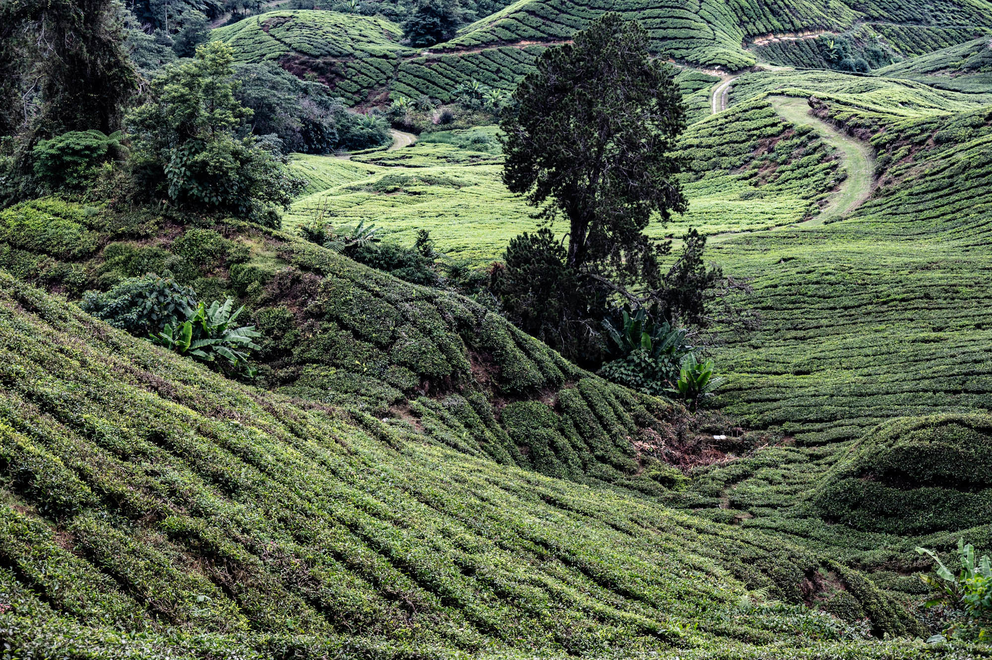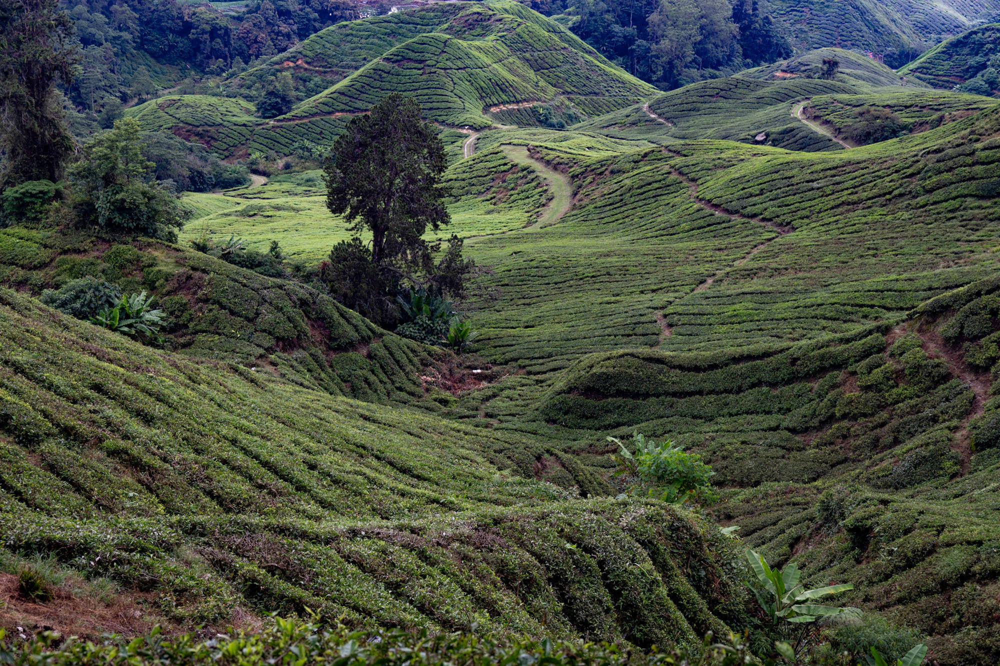Daar was ik dan eindelijk in de Camaron Highlands. Stond al eens op het programma maar nu liep ik toch echt door de theeplantages. Het was veel toeristischer dan Google en al die anderen je doen geloven, het was zelfs bombastisch te noemen. De drukte, de hoogbouw, de vreetschuren en vooral de overdosis aandacht voor de aardbei. Ik wist niet dat je zoveel entertainment om de aardbei heen kunt bouwen. Het hele landschap wordt verwoest door de kassen op vrijwel alle berghellingen. De oude Engelse landhuizen en hun gebouwen om macht uit te stralen worden helemaal aan het oog onttrokken om maar toeristen te trekken. Er zijn nog wat hotels uit vroegere tijden maar dat is zoeken. Gelukkig heb je voor thee geen kassen nodig en daar is de schoonheid nog te vinden, al duiken daar de springkussens en vermaak hallen ook al op. Natuurlijk ook de liefdesbogen om onder te gaan staan. En busjes om de luie mens langs die struiken te leiden. Lopen is ongezond dat blijkt maar weer. Ja het gaat op en af want die thee moet wel zoveel mogelijk zon pakken. Later, na uren lopen, beloonde ik mij met een kopje echte thee. Zo zetten ze die bij ons niet meer. Mijn oma maakte ze vroeger zo. Was ze heel secuur mee bezig. Met melk.