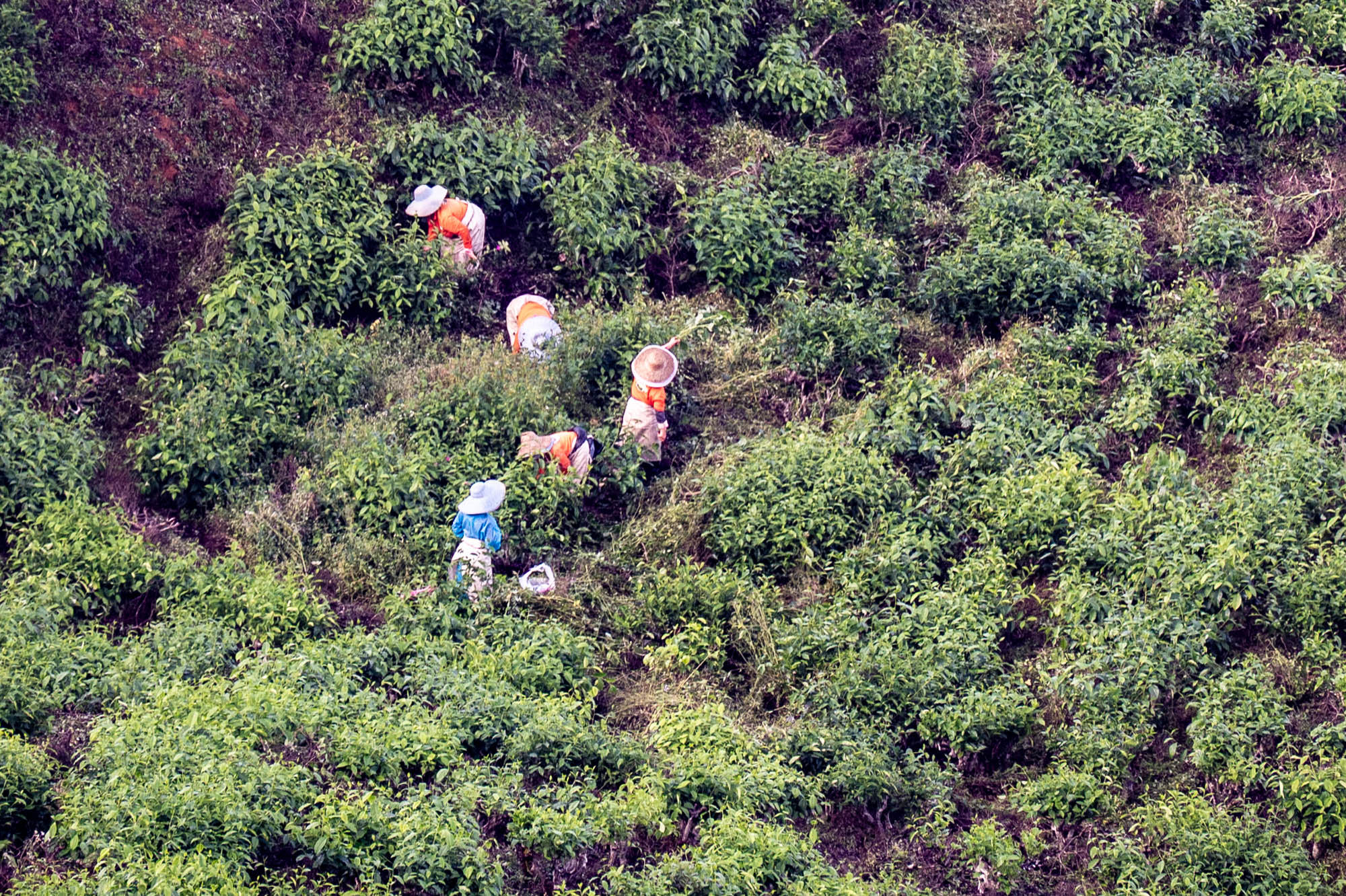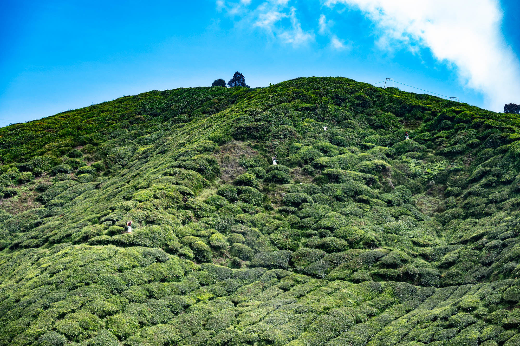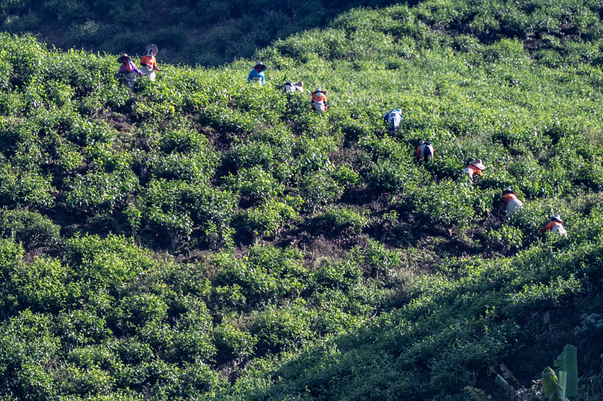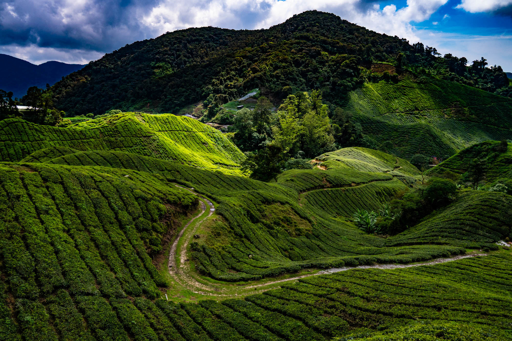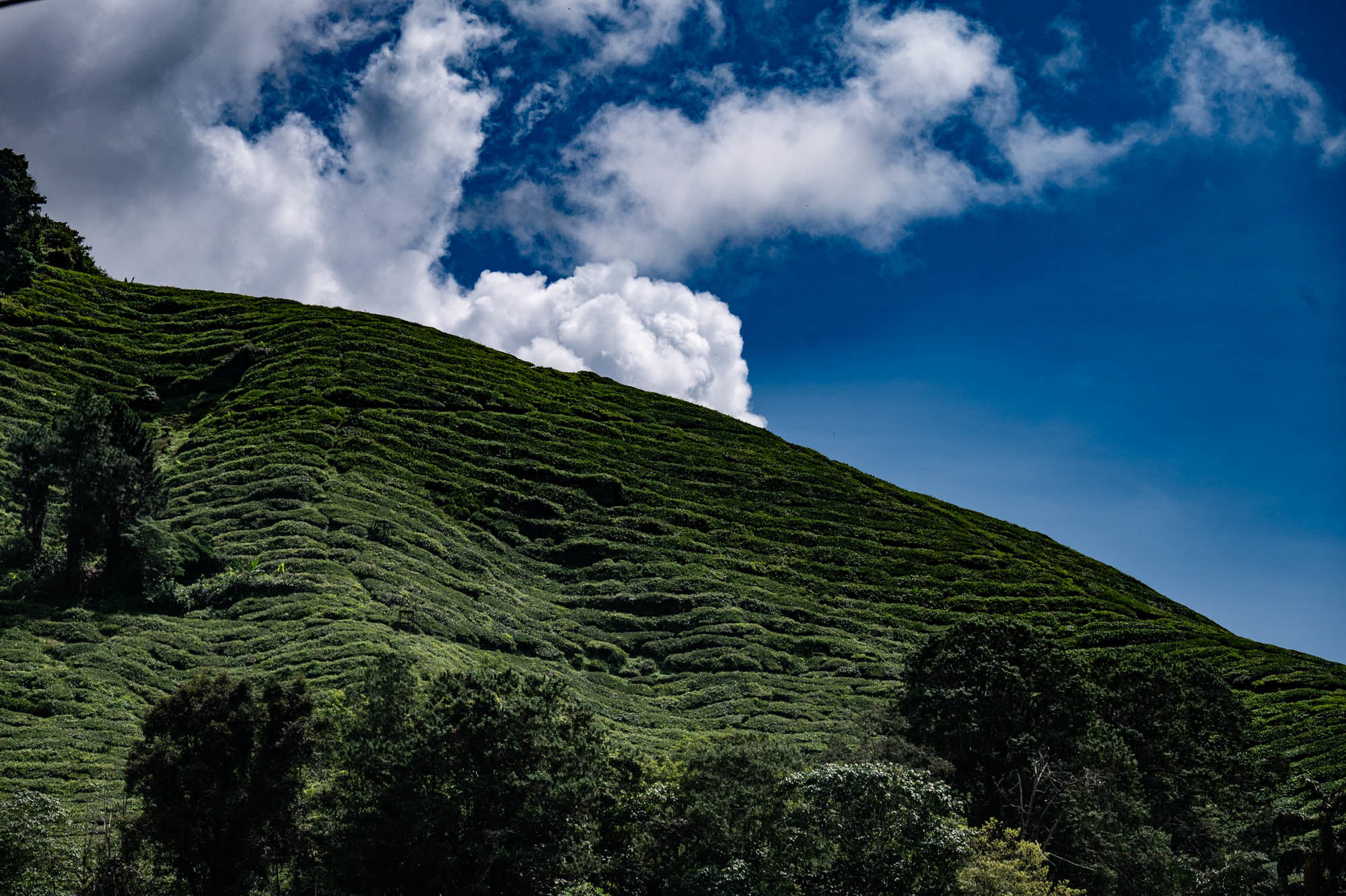 Daar was ik dan eindelijk in de Camaron Highlands. Stond al eens op het programma maar nu liep ik toch echt door de theeplantages. Het was veel toeristischer dan Google en al die anderen je doen geloven, het was zelfs bombastisch te noemen. De drukte, de hoogbouw, de vreetschuren en vooral de overdosis aandacht voor de aardbei. Ik wist niet dat je zoveel entertainment om de aardbei heen kunt bouwen. Het hele landschap wordt verwoest door de kassen op vrijwel alle berghellingen. De oude Engelse landhuizen en hun gebouwen om macht uit te stralen worden helemaal aan het oog onttrokken om maar toeristen te trekken. Er zijn nog wat hotels uit vroegere tijden maar dat is zoeken. Gelukkig heb je voor thee geen kassen nodig en daar is de schoonheid nog te vinden, al duiken daar de springkussens en vermaak hallen ook al op. Natuurlijk ook de liefdesbogen om onder te gaan staan. En busjes om de luie mens langs die struiken te leiden. Lopen is ongezond dat blijkt maar weer. Ja het gaat op en af want die thee moet wel zoveel mogelijk zon pakken. Later, na uren lopen, beloonde ik mij met een kopje echte thee. Zo zetten ze die bij ons niet meer. Mijn oma maakte ze vroeger zo. Was ze heel secuur mee bezig. Met melk.