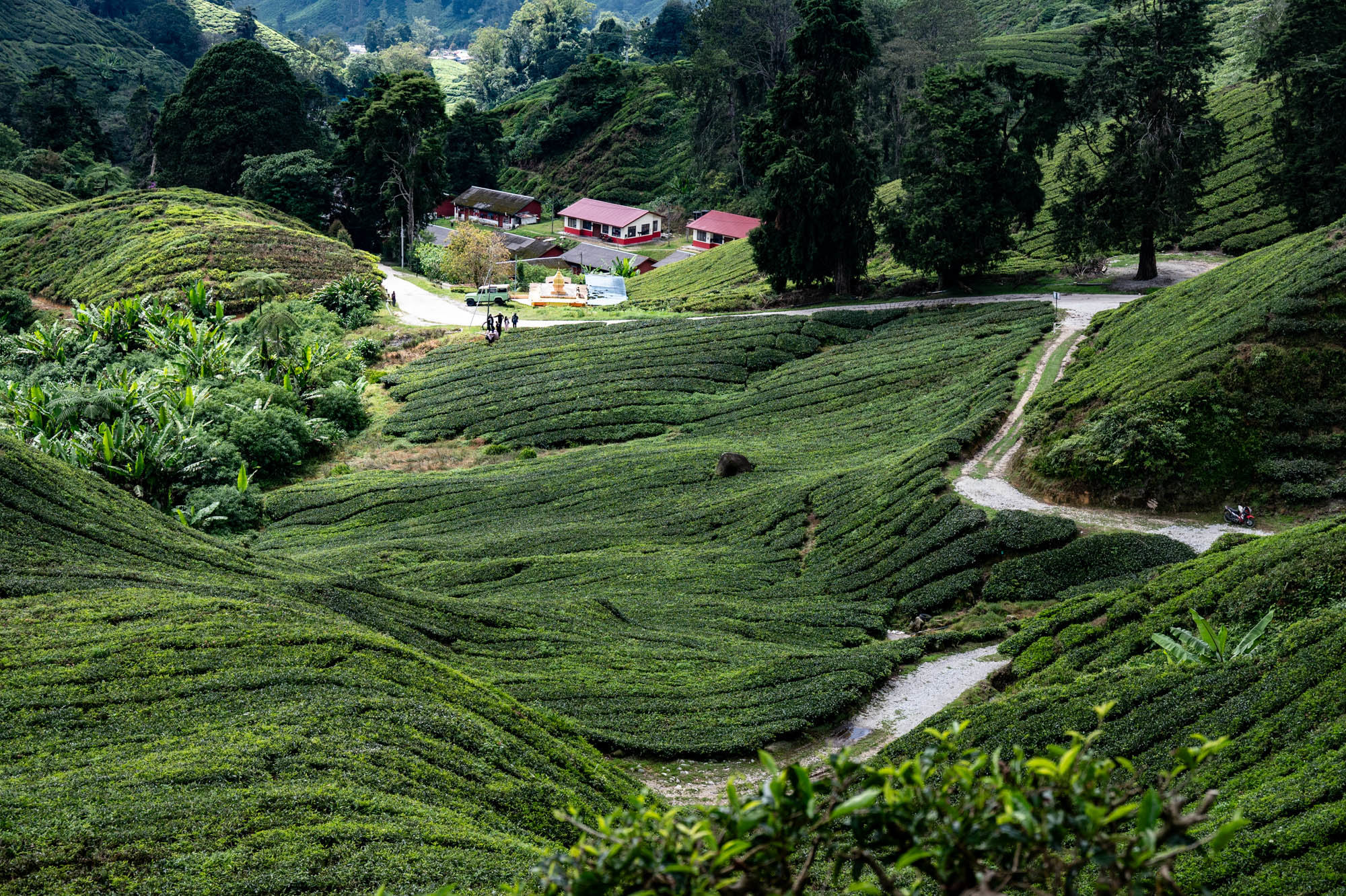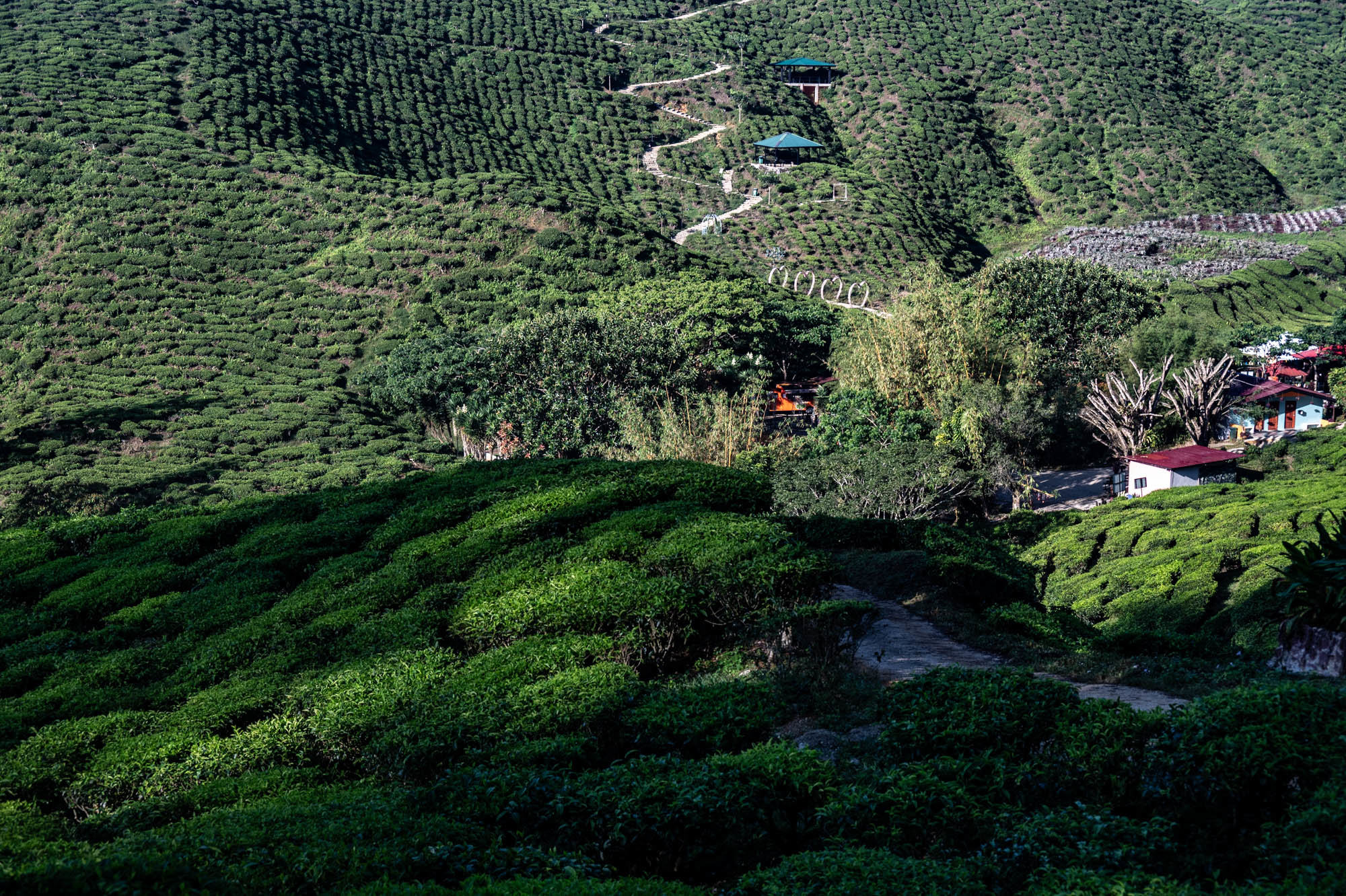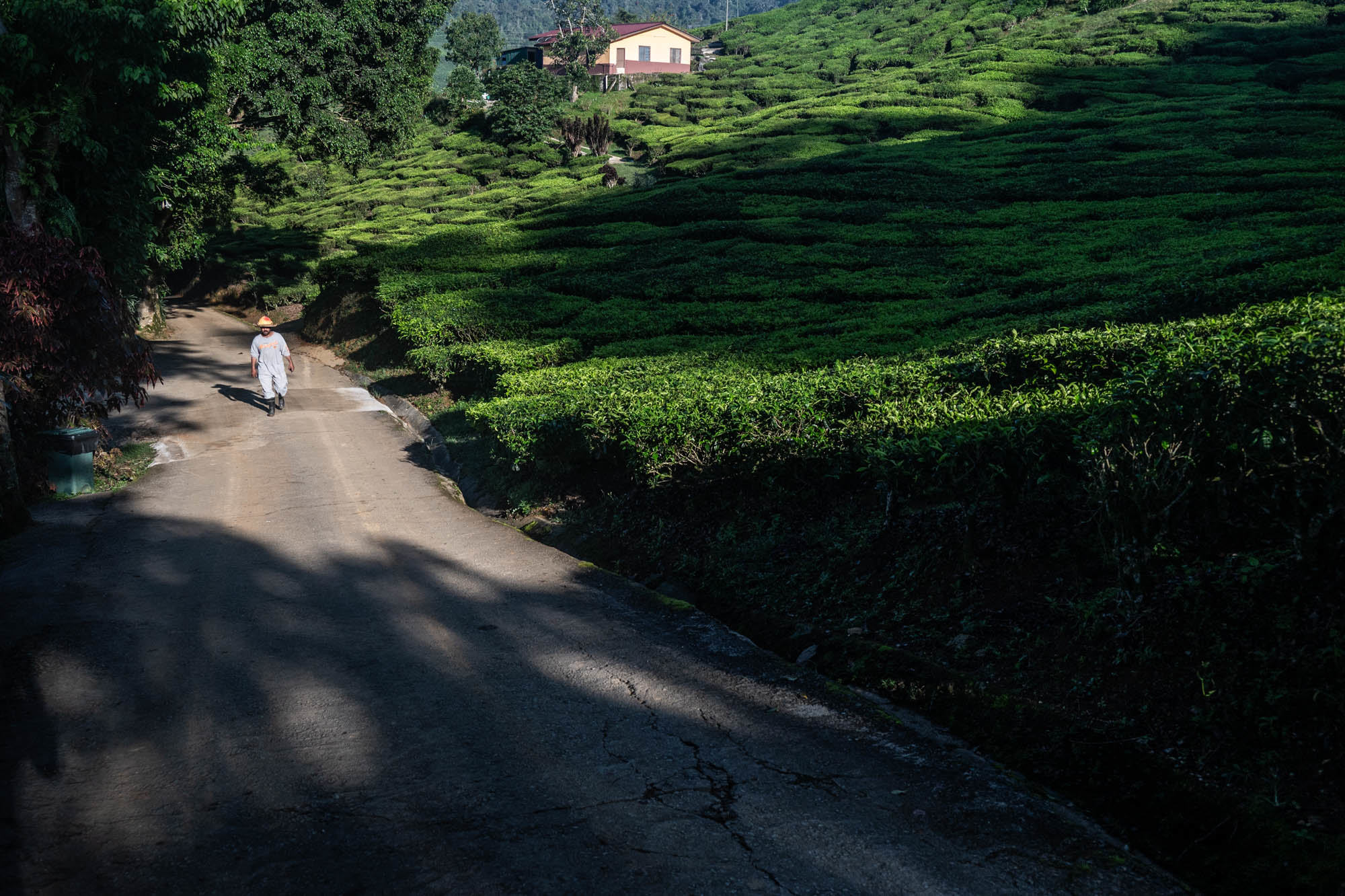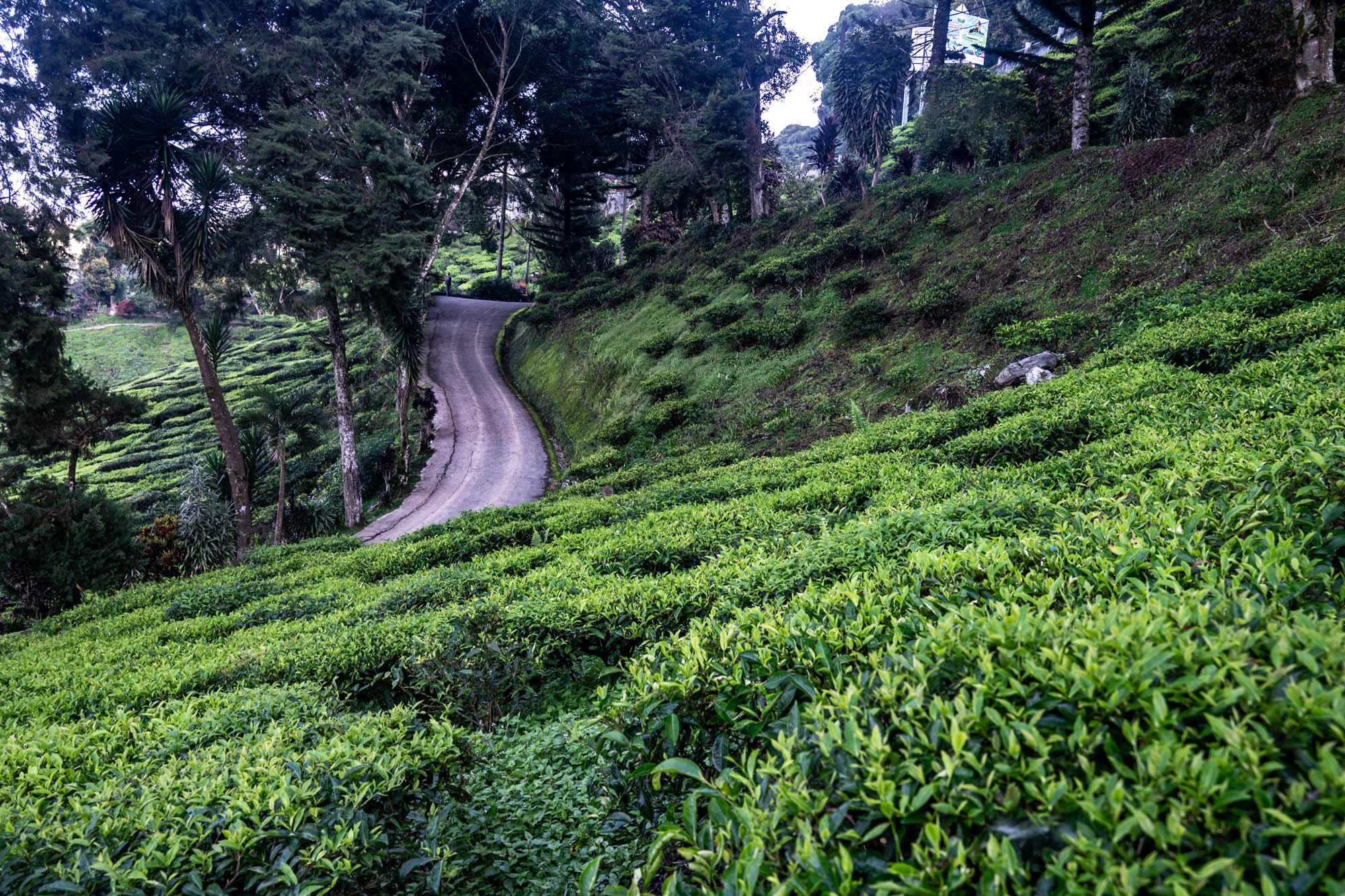 And there I was at last in the Cameron Highlands. It had been on the itinerary for a while, but now I was actually walking through the tea plantations. It was much more touristy than Google and all the others would have you believe; it was even bombastic. The crowds, the high-rises, the fast-food joints, and especially the overdose of attention focused on the strawberry. I didn't know you could build so much entertainment around the strawberry. The entire landscape is being ruined by greenhouses on virtually every mountain slope. The old English country houses and their structures designed to project power are completely hidden from view just to attract tourists. There are still some hotels from earlier times, but you have to search for them. Fortunately, you don't need greenhouses for tea, and that is where the beauty can still be found, although bouncy castles and amusement halls are starting to pop up there too. And of course, the love arches to stand under. And buses to guide the lazy person past those bushes. Walking is unhealthy, as is evident once again. Yes, it goes up and down, because that tea needs to catch as much sun as possible. Later, after hours of walking, I rewarded myself with a cup of real tea. They don't make it like that at home anymore. My granny used to make them like that. She was very meticulous about it. With milk.