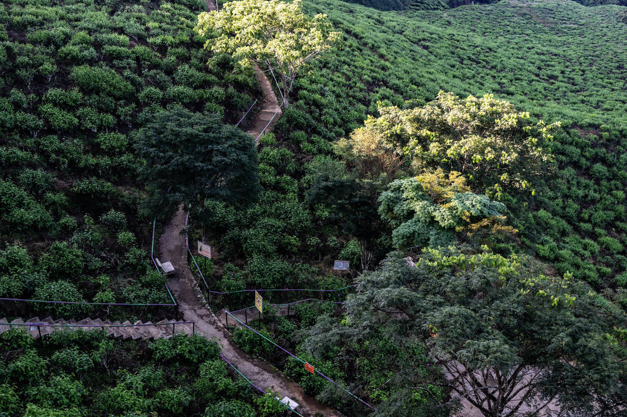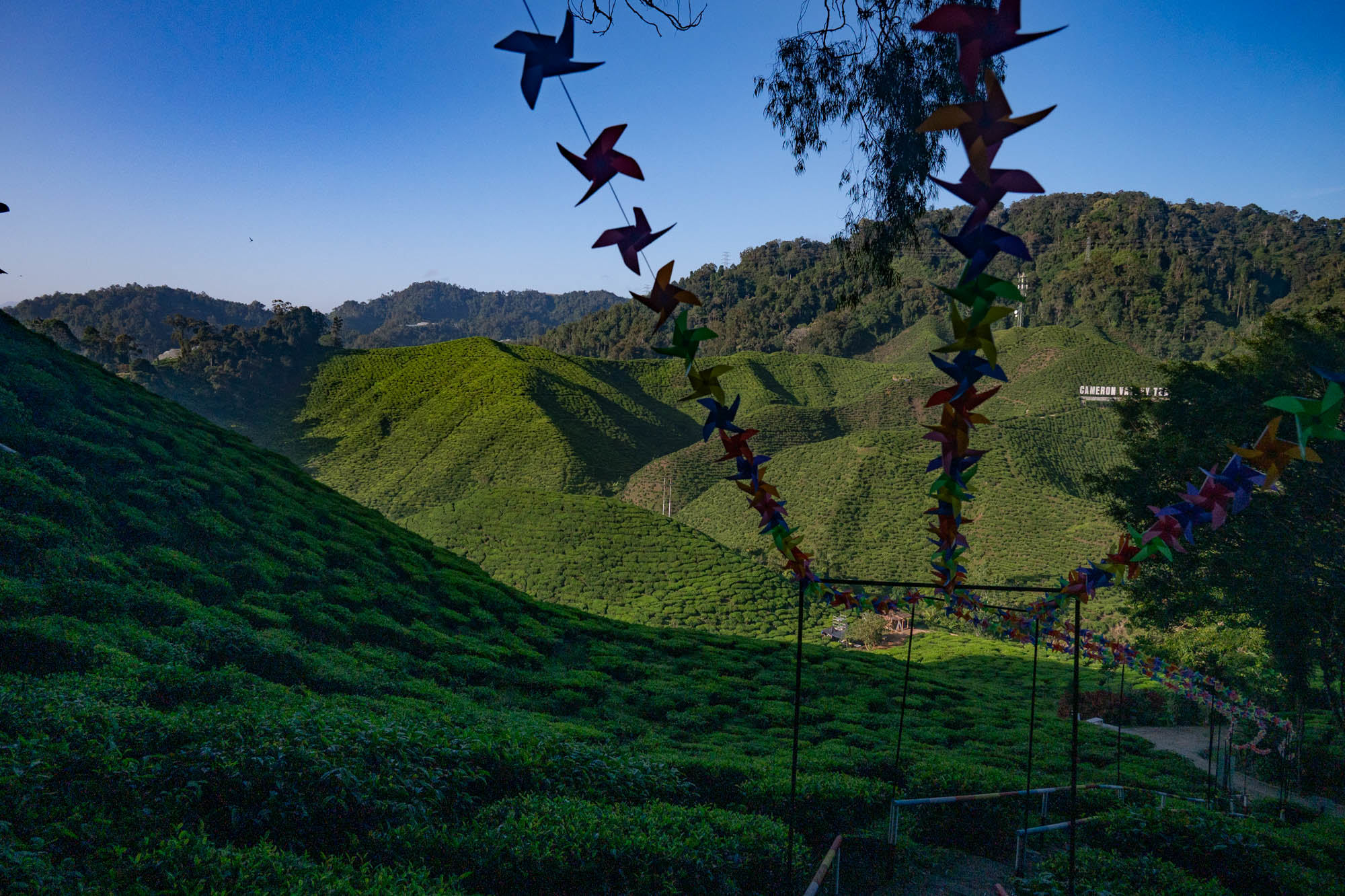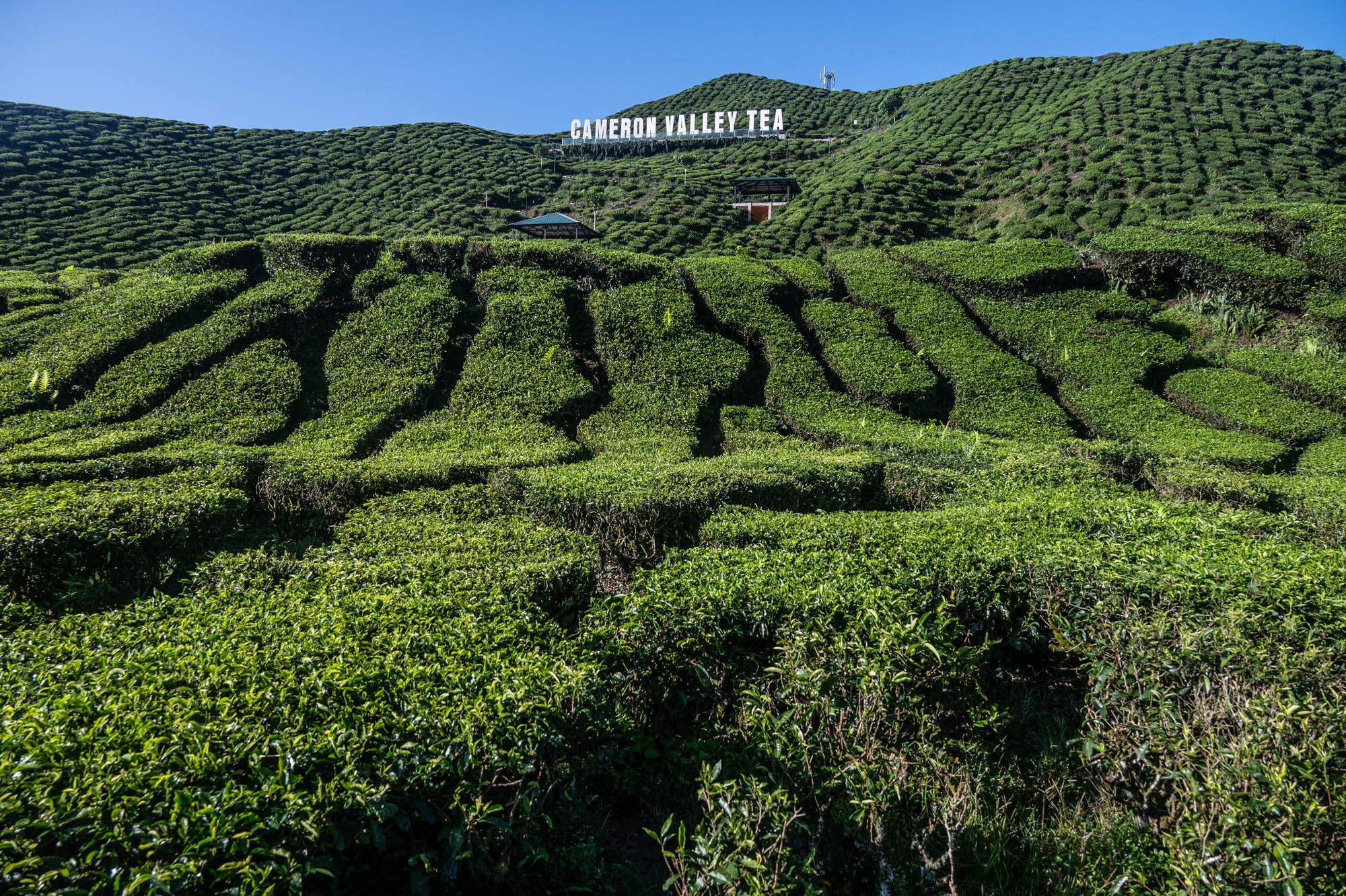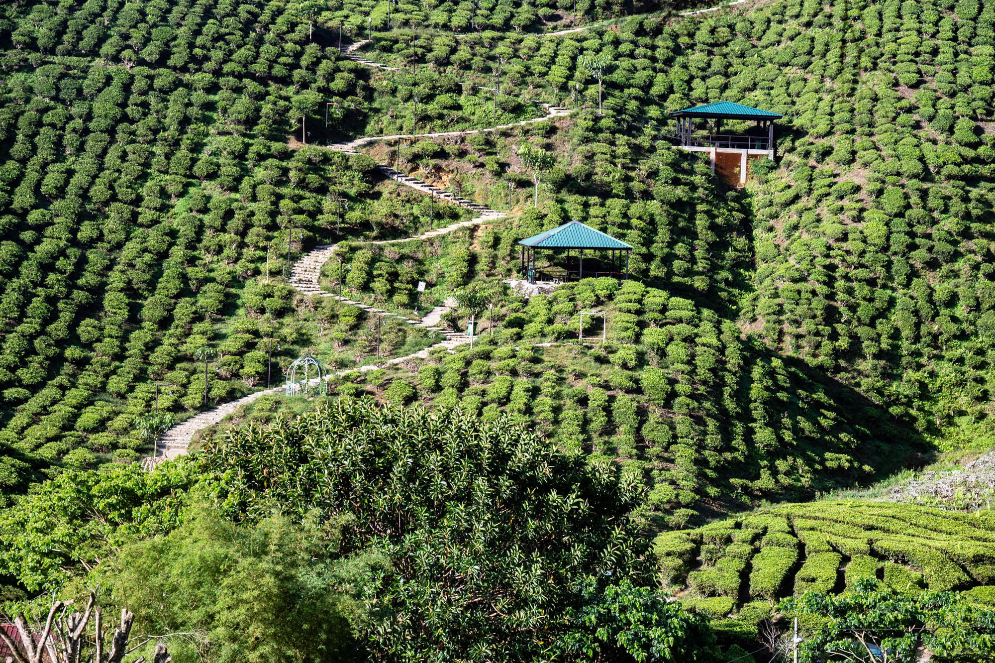 And there I was at last in the Cameron Highlands. It had been on the itinerary for a while, but now I was actually walking through the tea plantations. It was much more touristy than Google and all the others would have you believe; it was even bombastic. The crowds, the high-rises, the fast-food joints, and especially the overdose of attention focused on the strawberry. I didn't know you could build so much entertainment around the strawberry. The entire landscape is being ruined by greenhouses on virtually every mountain slope. The old English country houses and their structures designed to project power are completely hidden from view just to attract tourists. There are still some hotels from earlier times, but you have to search for them. Fortunately, you don't need greenhouses for tea, and that is where the beauty can still be found, although bouncy castles and amusement halls are starting to pop up there too. And of course, the love arches to stand under. And buses to guide the lazy person past those bushes. Walking is unhealthy, as is evident once again. Yes, it goes up and down, because that tea needs to catch as much sun as possible. Later, after hours of walking, I rewarded myself with a cup of real tea. They don't make it like that at home anymore. My granny used to make them like that. She was very meticulous about it. With milk.
