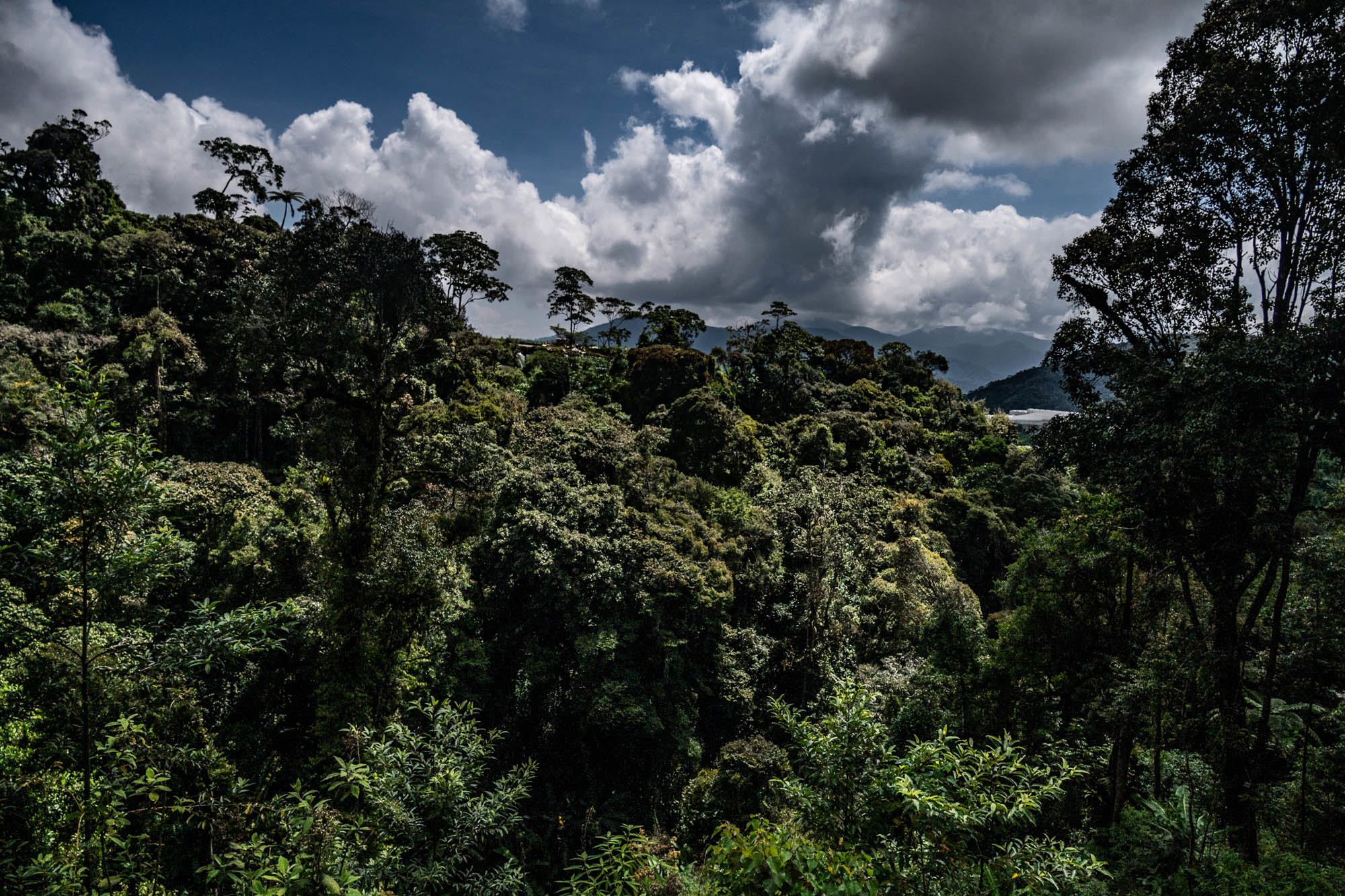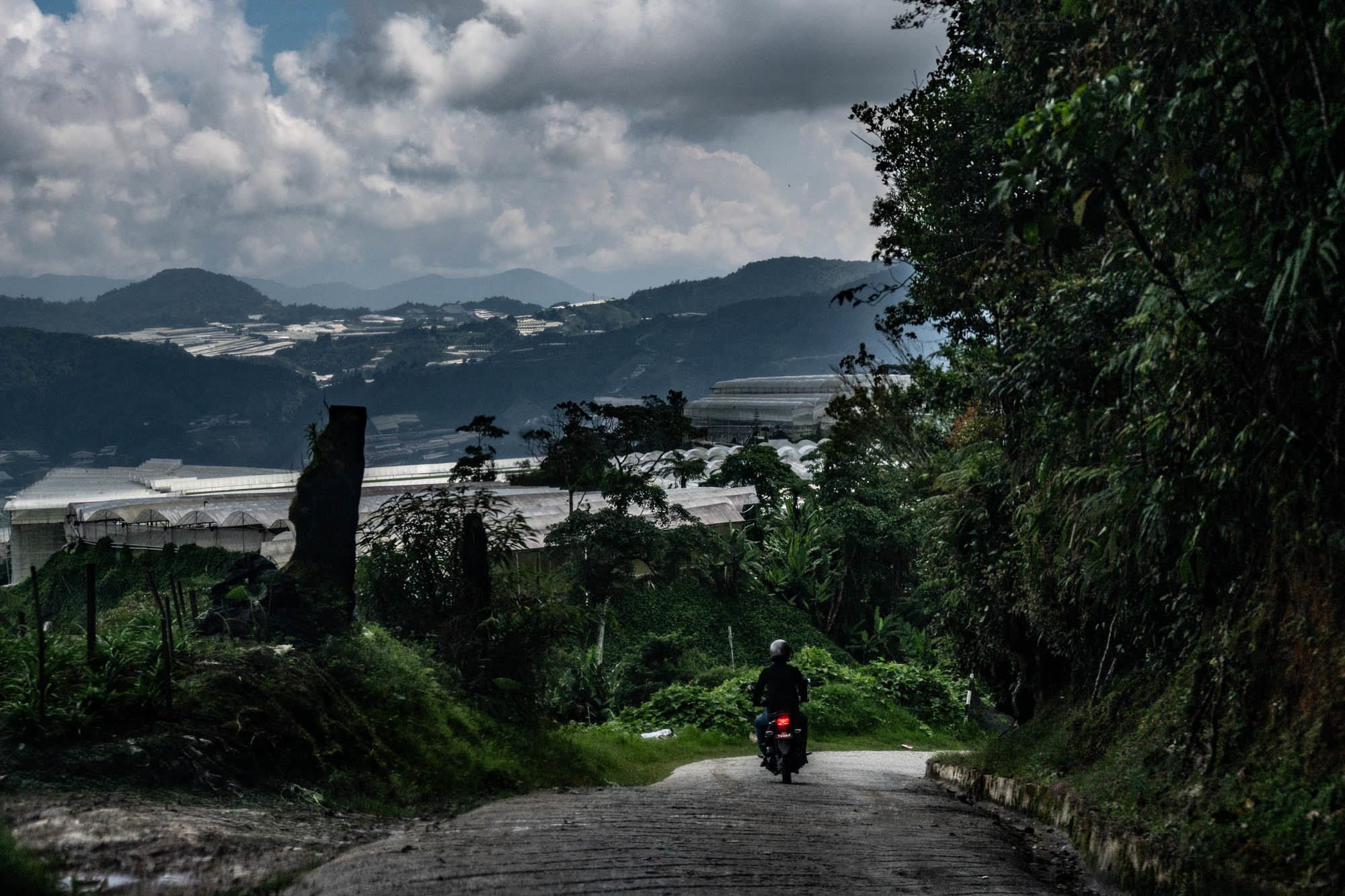 Vlak voordat ik de Camaron Highlands weer achter mij liet, besloot ik ook nog met mijn koffiemolentje van een onbestemd merk de Gunung Brinchang op te rijden. Ja, het was steil en ja niet overal een propere bestrating maar ik begon onraad te voelen toen er alleen nog maar Landrovers naar beneden kwamen. Moest ook nog een hek open maken en vlak daarna werd ik toch echt tegengehouden. Ze moesten lachen, die Landrover patsers, maar ik werd dringend verzocht die laatste 600 meter niet meer te proberen. Ach, het uitzicht was daar ook al mooi.