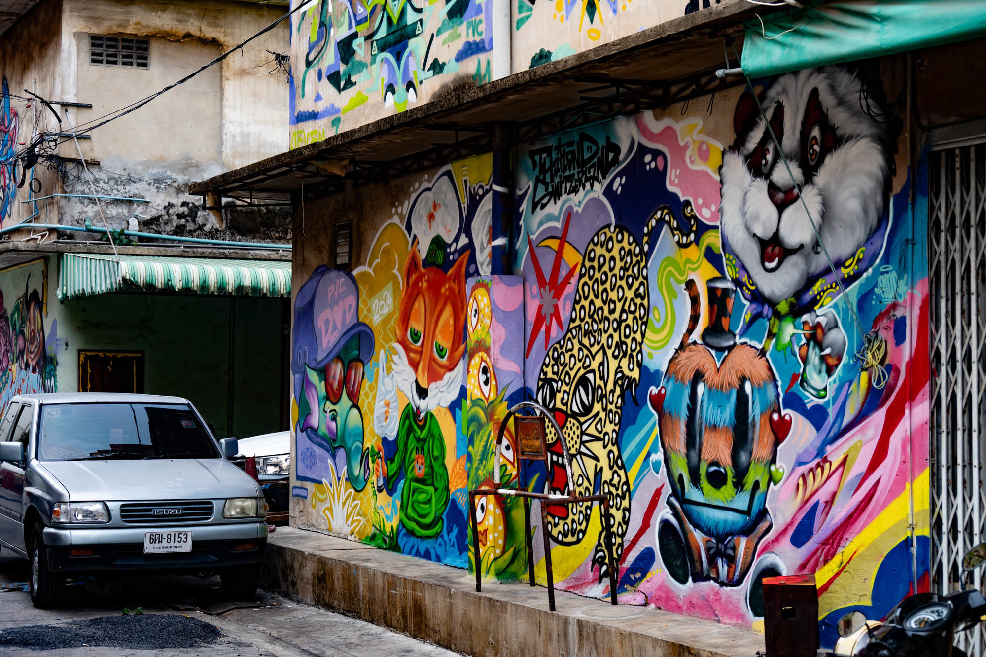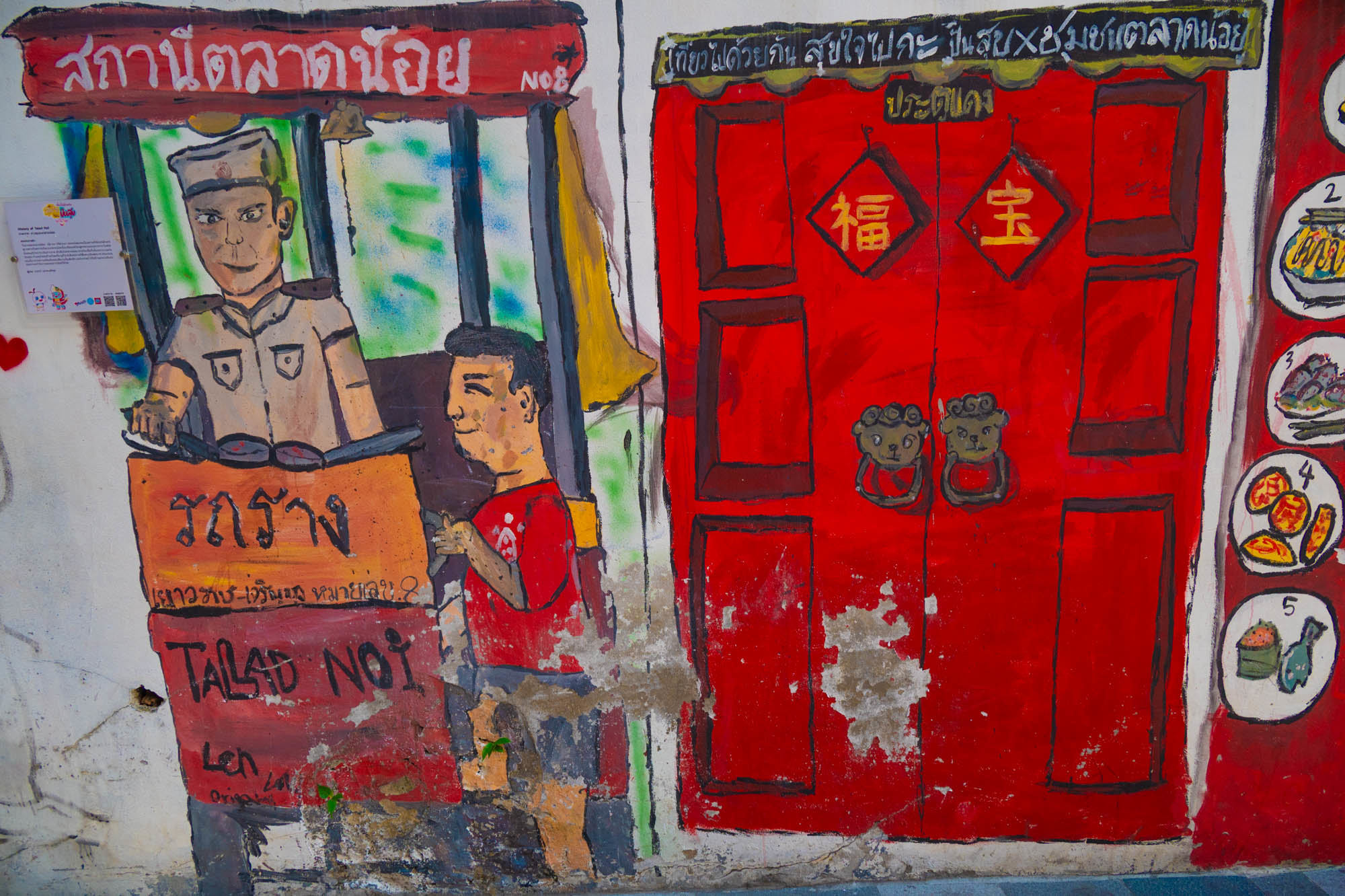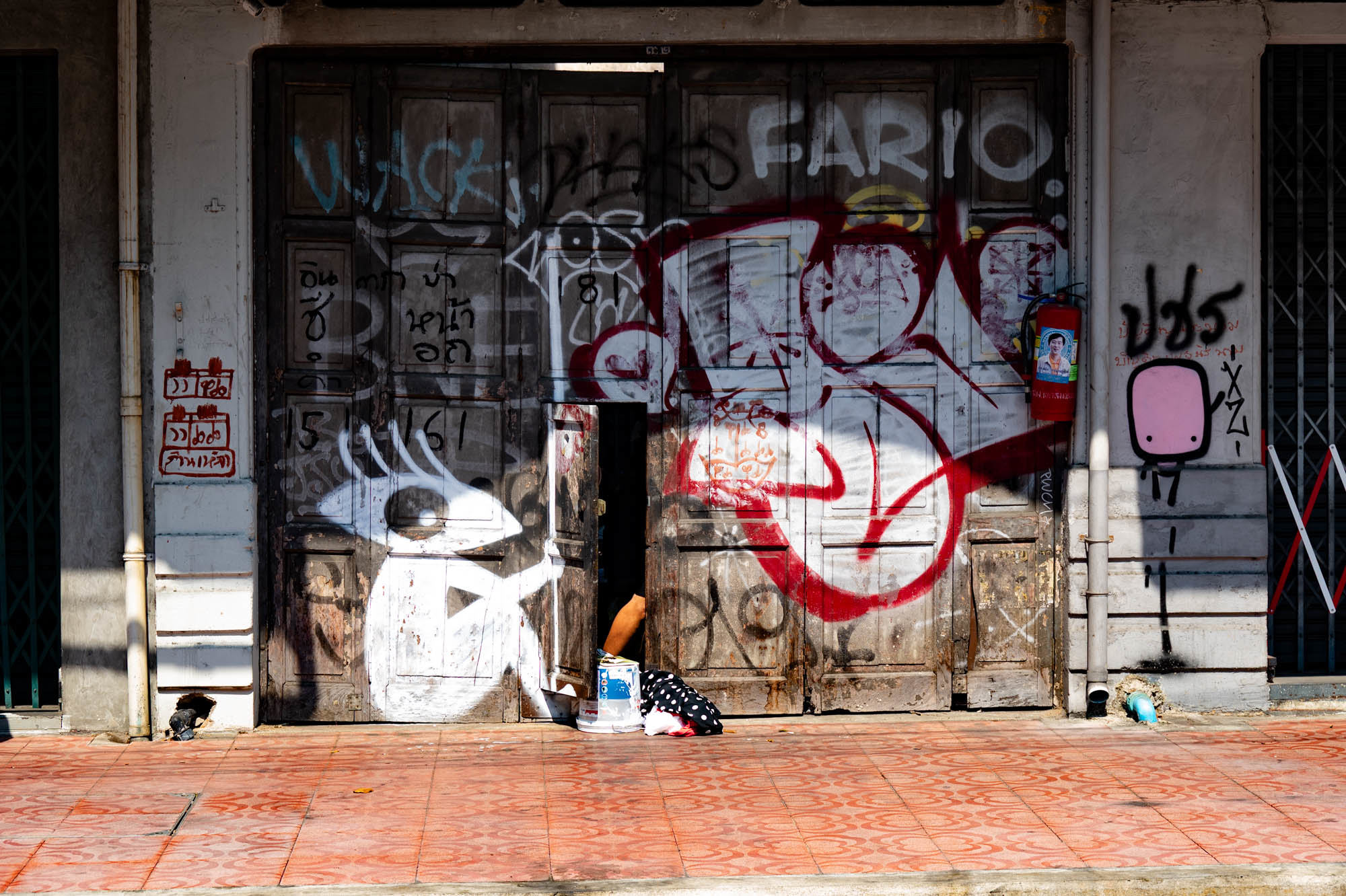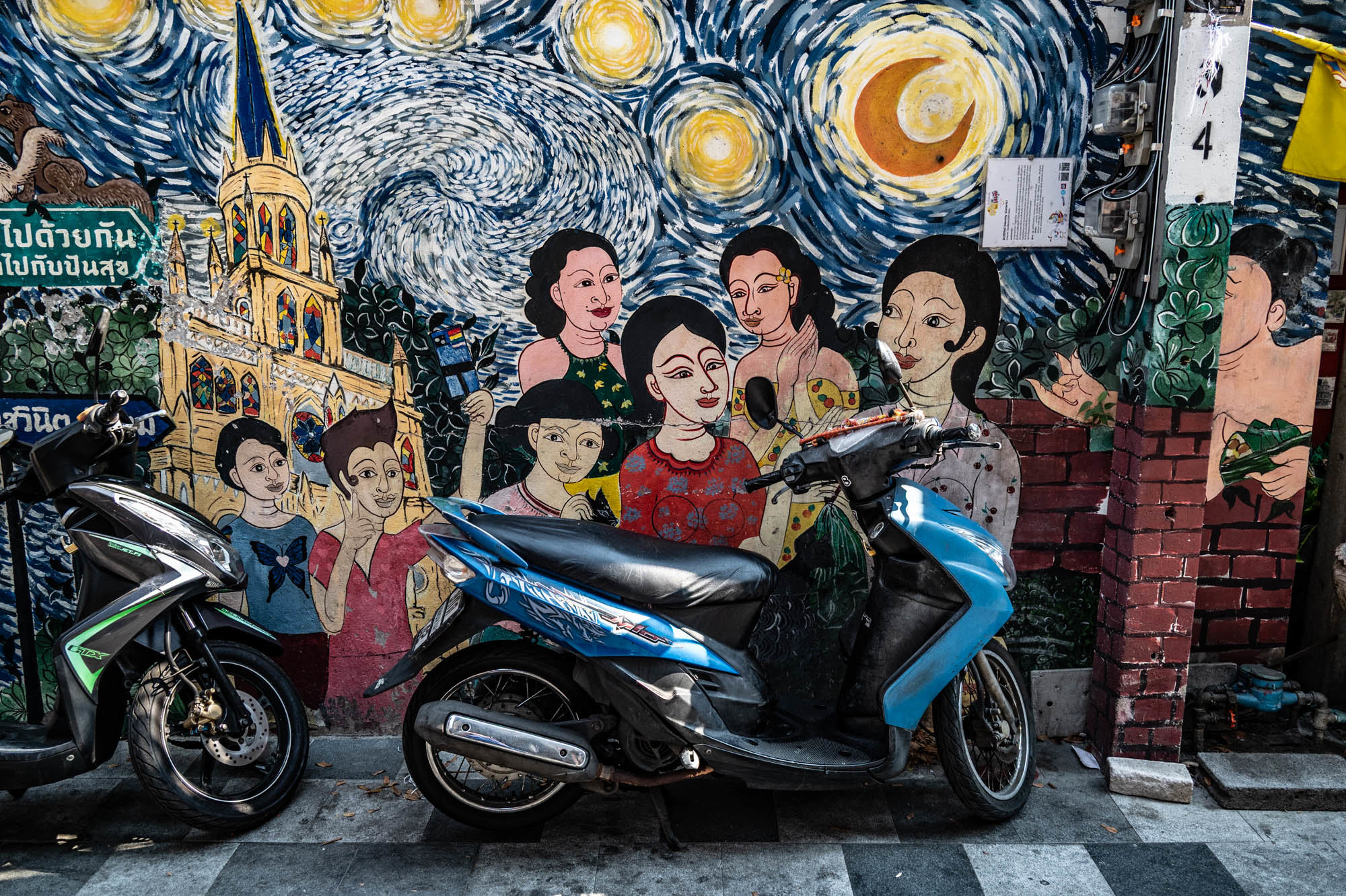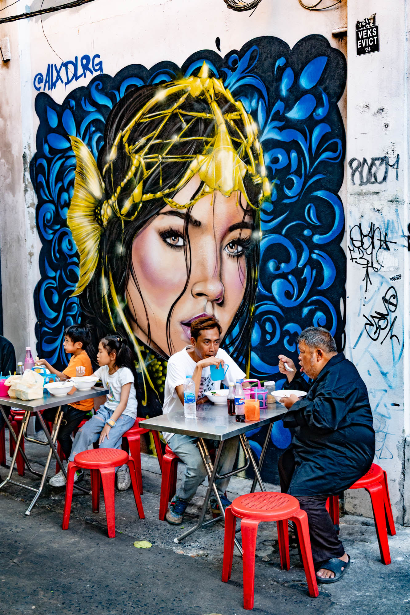 Weer een dag met alledaagse dingen. Bangkok zit er vol mee. Oude dingen, moderne dingen, vreemde dingen en soms dingen die gewoon heel, heel cool zijn. En tandartsen hebben ze ook. Snel, zonder afspraak, en voor dertig euro maken ze je gebit weer toonbaar. Ik zat bij Dr. Dentreat. Prima tandarts. Of het een man of vrouw was, is me nog steeds niet helemaal duidelijk, door al het gesproei was het zicht beperkt. Hun sprak geen Engels dus vragen had geen zin. De assistente sprak het wel, maar was voor mij grotendeels onverstaanbaar. Ongetwijfeld heb ik een reeks uitstekende adviezen gemist en negeer ik nu onbewust iets essentieels. We gaan het merken. Voor die tijd maakte ik een wandeling door Talat Noi. Een wijk waar het oude Chinatown nog deels overeind staat. Dat is niet zozeer te danken aan de geschiedenis, maar aan de jeugd, die ziet in verval juist kansen en begint er barretjes, koffietentjes en creatieve hangplekken. Geweldige plekken om te eten, te drinken, te chillen en vooral om op je telefoon te zitten. Fotograferen met zo’n ding mocht overigens bijna nergens. Maar gelukkig heb ik nog zo’n ouderwetse camera van twee kilo. Dat begrijpen ze hier niet altijd, dus een beetje ruimte om toch mijn gang te gaan. Overal duiken ze op: graffiti en murals. Soms grappig, soms rauw, vaak gewoon echt goed. Ik maakte hier een paar jaar geleden al eens een serie, en het niveau is alleen maar hoger geworden. Topkunst, verstopt tussen roest, rommel en renovatie. Opvallend: nog steeds overal beelden van de oude koning. De nieuwe weet het volk duidelijk minder te raken. Hij slaat, om het voorzichtig te zeggen, nog geen deuk in een pakje boter.