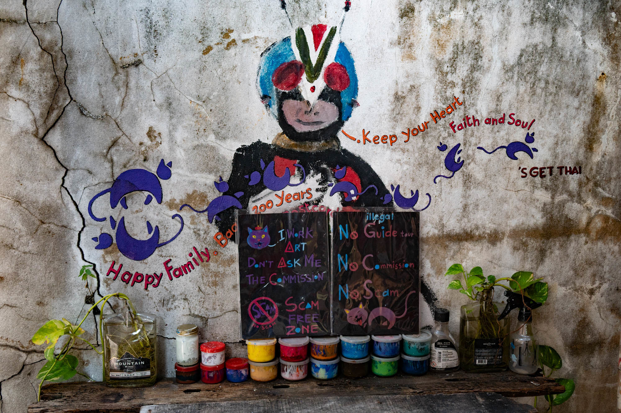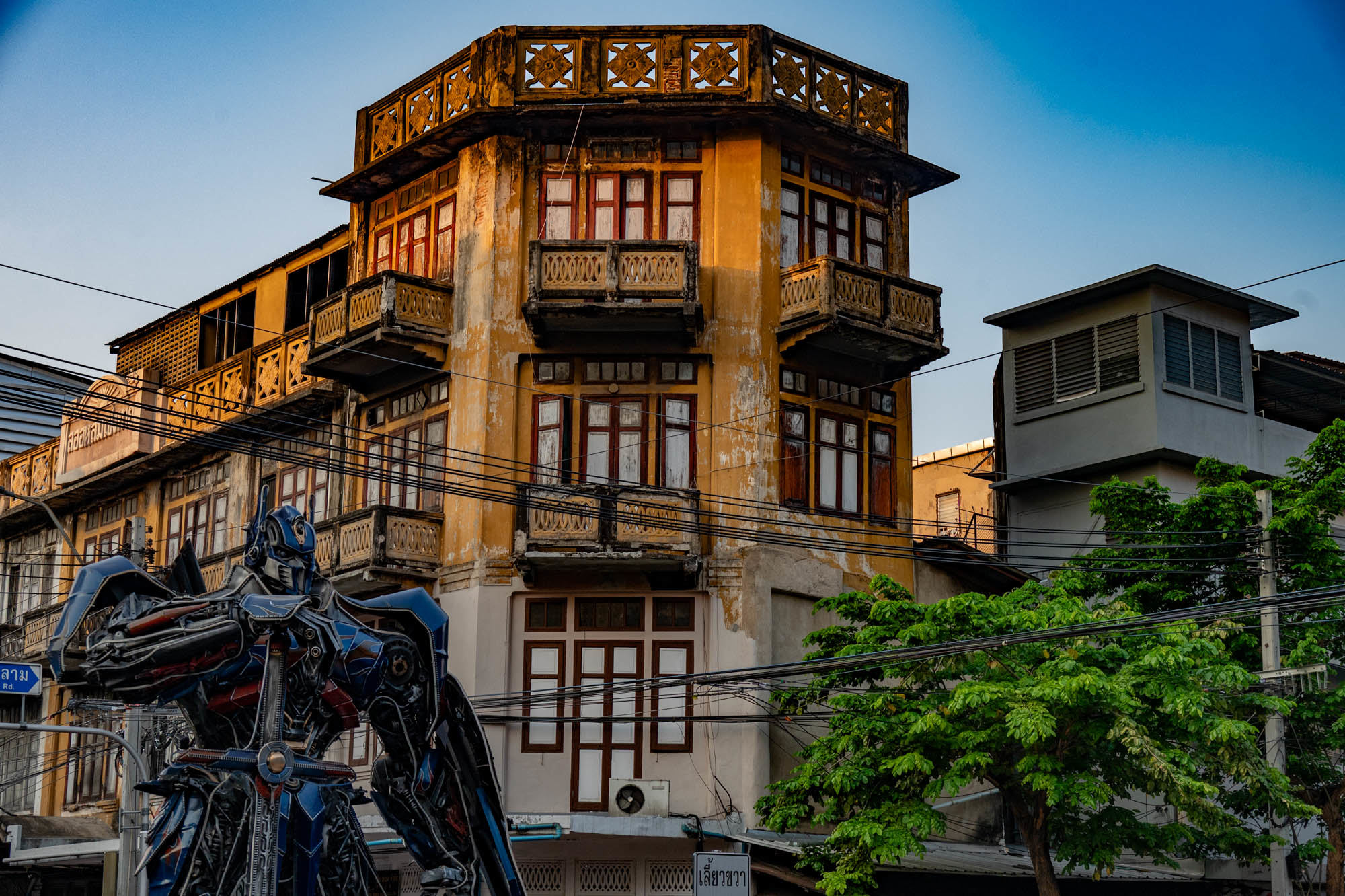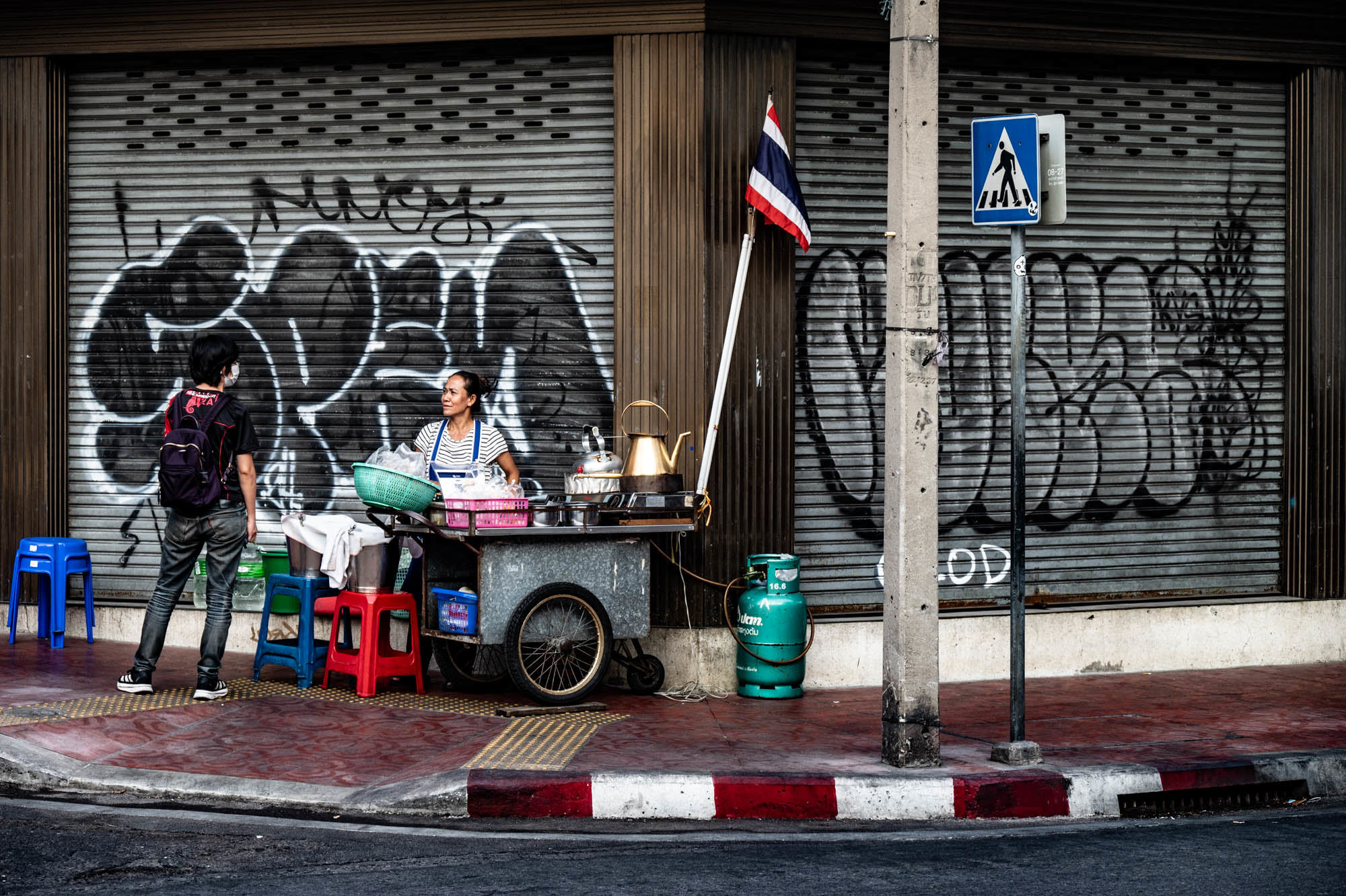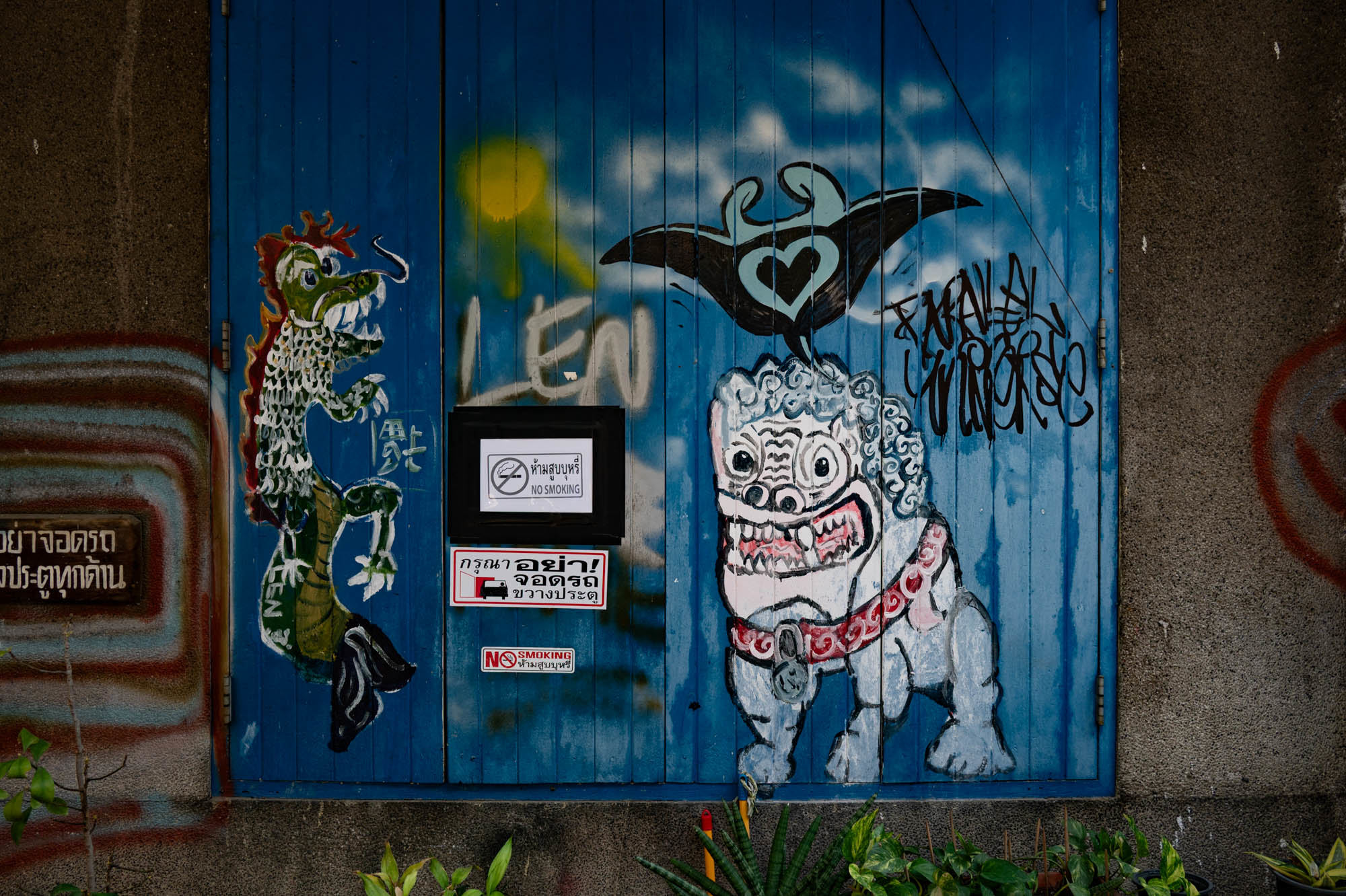 Weer een dag met alledaagse dingen. Bangkok zit er vol mee. Oude dingen, moderne dingen, vreemde dingen en soms dingen die gewoon heel, heel cool zijn. En tandartsen hebben ze ook. Snel, zonder afspraak, en voor dertig euro maken ze je gebit weer toonbaar. Ik zat bij Dr. Dentreat. Prima tandarts. Of het een man of vrouw was, is me nog steeds niet helemaal duidelijk, door al het gesproei was het zicht beperkt. Hun sprak geen Engels dus vragen had geen zin. De assistente sprak het wel, maar was voor mij grotendeels onverstaanbaar. Ongetwijfeld heb ik een reeks uitstekende adviezen gemist en negeer ik nu onbewust iets essentieels. We gaan het merken. Voor die tijd maakte ik een wandeling door Talat Noi. Een wijk waar het oude Chinatown nog deels overeind staat. Dat is niet zozeer te danken aan de geschiedenis, maar aan de jeugd, die ziet in verval juist kansen en begint er barretjes, koffietentjes en creatieve hangplekken. Geweldige plekken om te eten, te drinken, te chillen en vooral om op je telefoon te zitten. Fotograferen met zo’n ding mocht overigens bijna nergens. Maar gelukkig heb ik nog zo’n ouderwetse camera van twee kilo. Dat begrijpen ze hier niet altijd, dus een beetje ruimte om toch mijn gang te gaan. Overal duiken ze op: graffiti en murals. Soms grappig, soms rauw, vaak gewoon echt goed. Ik maakte hier een paar jaar geleden al eens een serie, en het niveau is alleen maar hoger geworden. Topkunst, verstopt tussen roest, rommel en renovatie. Opvallend: nog steeds overal beelden van de oude koning. De nieuwe weet het volk duidelijk minder te raken. Hij slaat, om het voorzichtig te zeggen, nog geen deuk in een pakje boter.