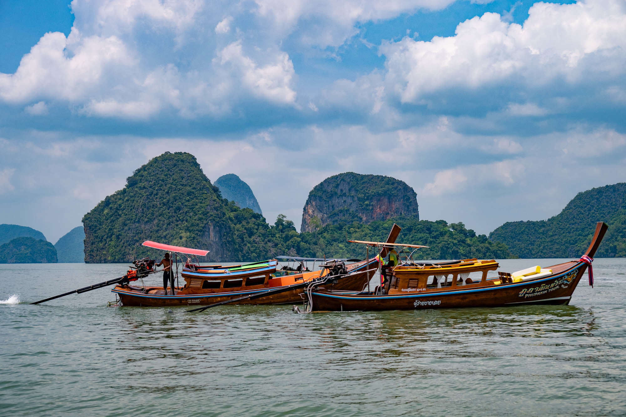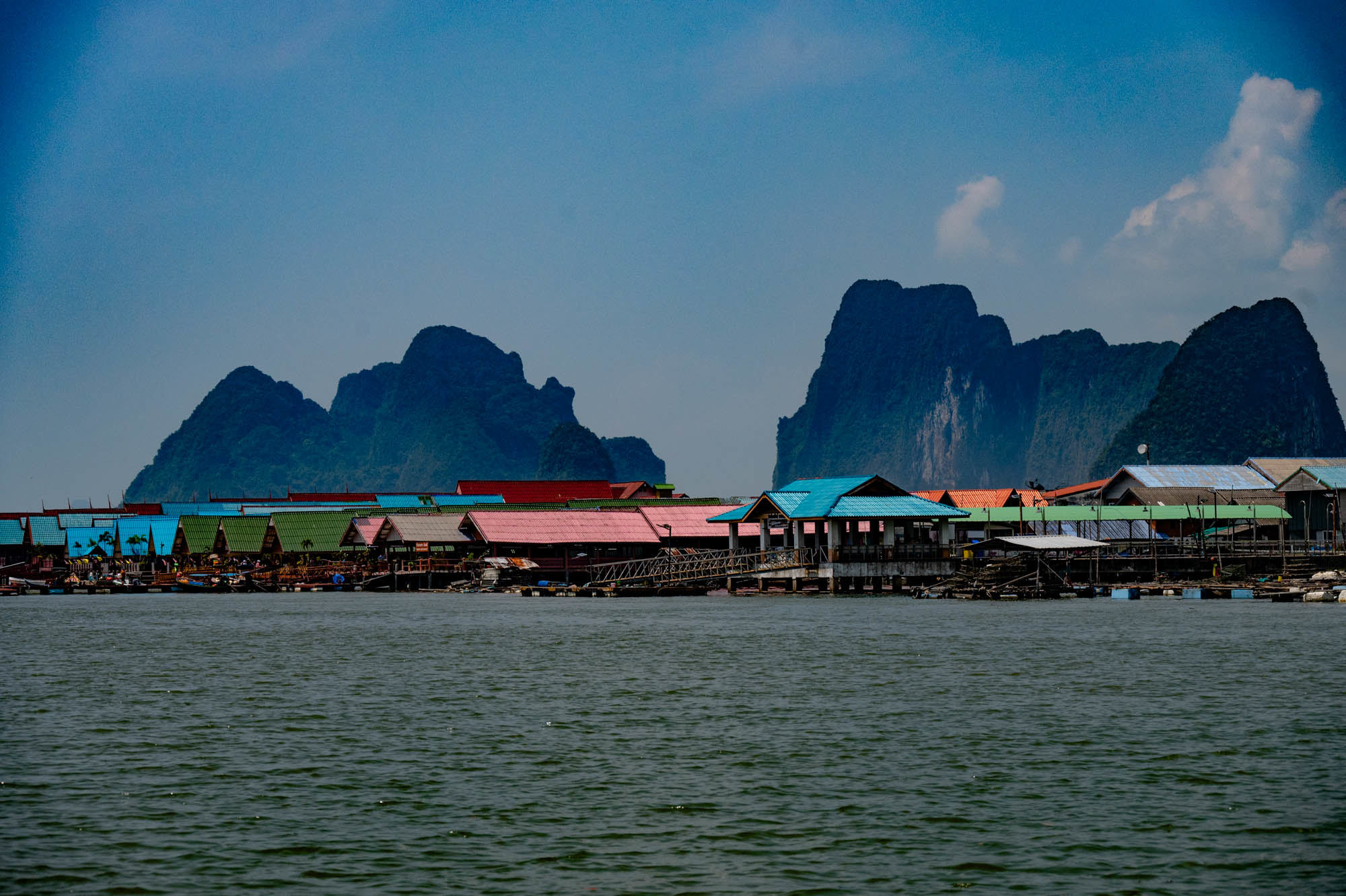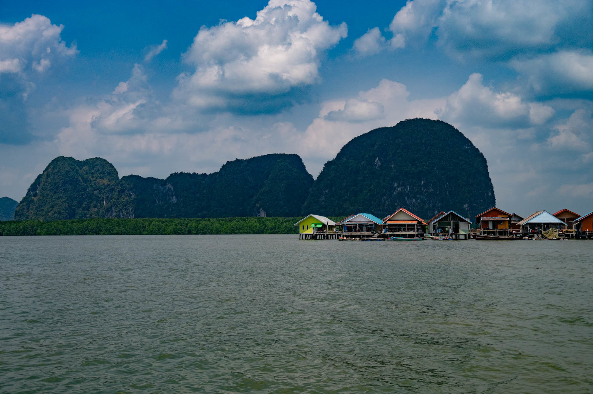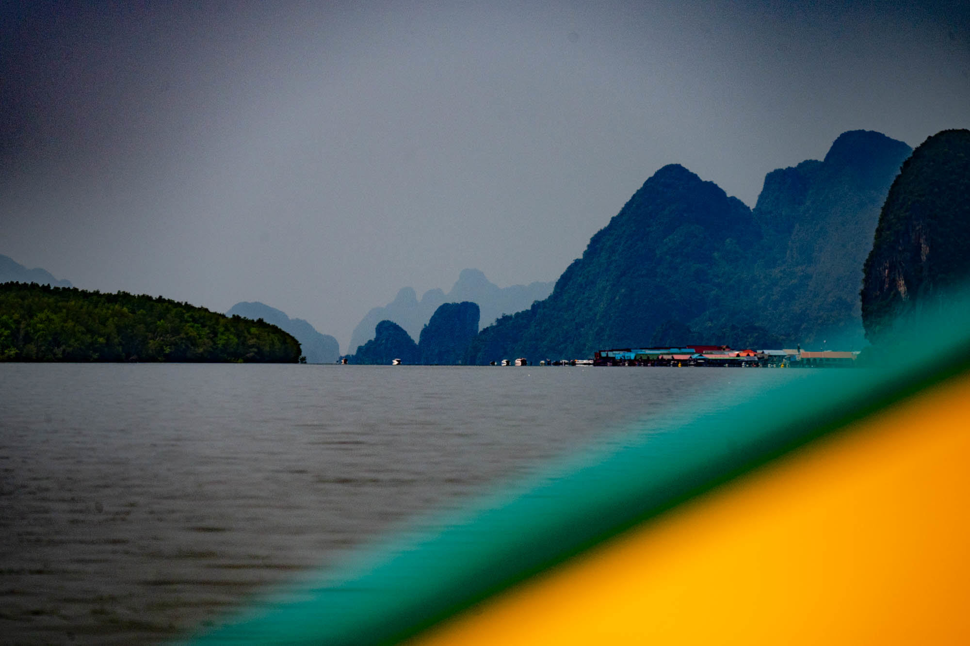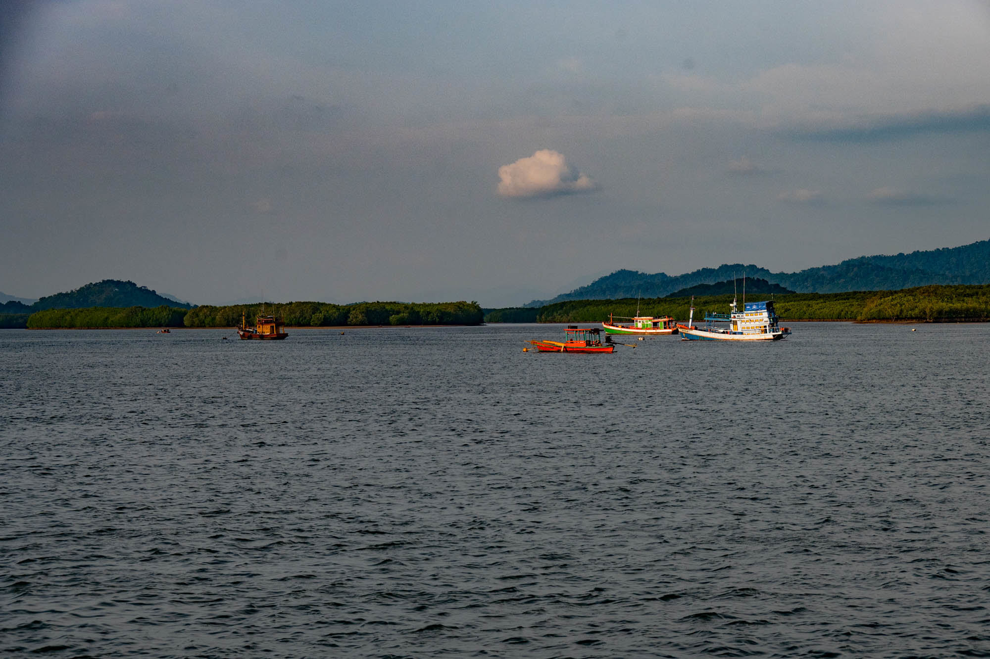 Gisteren afscheid genomen van de boys. En, iets te voortvarend, ook van de foto’s van die dag, een fractie te snel van de camera verwijderd. Weg herinneringen, of in ieder geval: zonder bewijs. Maar nu dan terug op Phuket want daar ten noorden valt nog wat te ontdekken, al is er ook al genoeg ontgonnen. Eerste stop: Phang Nga Bay. Maar zonder boot zie je er weinig meer dan een soort Zuiderplas. Dus: een boot geregeld. Dat kost wat, vraagt om stevig onderhandelen, en levert uiteindelijk een licht ongemakkelijke zitplek op vanwaar je naar rotsen en water staart. Indrukwekkende rotsen, dat wel. Uiteraard hebben ze allemaal de vorm van dieren, als je maar lang genoeg kijkt. De bekende plekken komen voorbij, tot en met het inmiddels volledig uitgemolken James Bond Island. Nieuw voor mij waren de kano’s, maar voor de rest voelde het als een déjà vu. Ik was hier tenslotte al twee keer eerder, lang geleden. Het moslimdorp op palen stond er nog steeds. Alleen met ietsje wat meer winkeltjes. Jezus. Opmerkelijk hoe in veertig jaar de tanige, gebruinde vissers ineens hun BMI in de gaten lijken te moeten houden. De tocht was eigenlijk overbodig maar de nostalgie wil ook wat. Na een paar uurtje cruisen door bergen en bossen met zo nu en dan een dorpje reed ik Takua Pa binnen. Een wonderlijk mooi geconserveerd stadje. Ik was nu echt terug in de tijd. Een cadeautje. De tocht had mij weer vlakbij de kust gebracht dus de keuze viel op een strandje om te slapen. De reservering vermelde niet dat de bungalows op een eilandje lagen en de rit van een half uurtje werd vanwege de veerboot een uurtje langer. Wachten bij een haventje is geen straf en ik was nog net voor zonsondergang op het strandje.